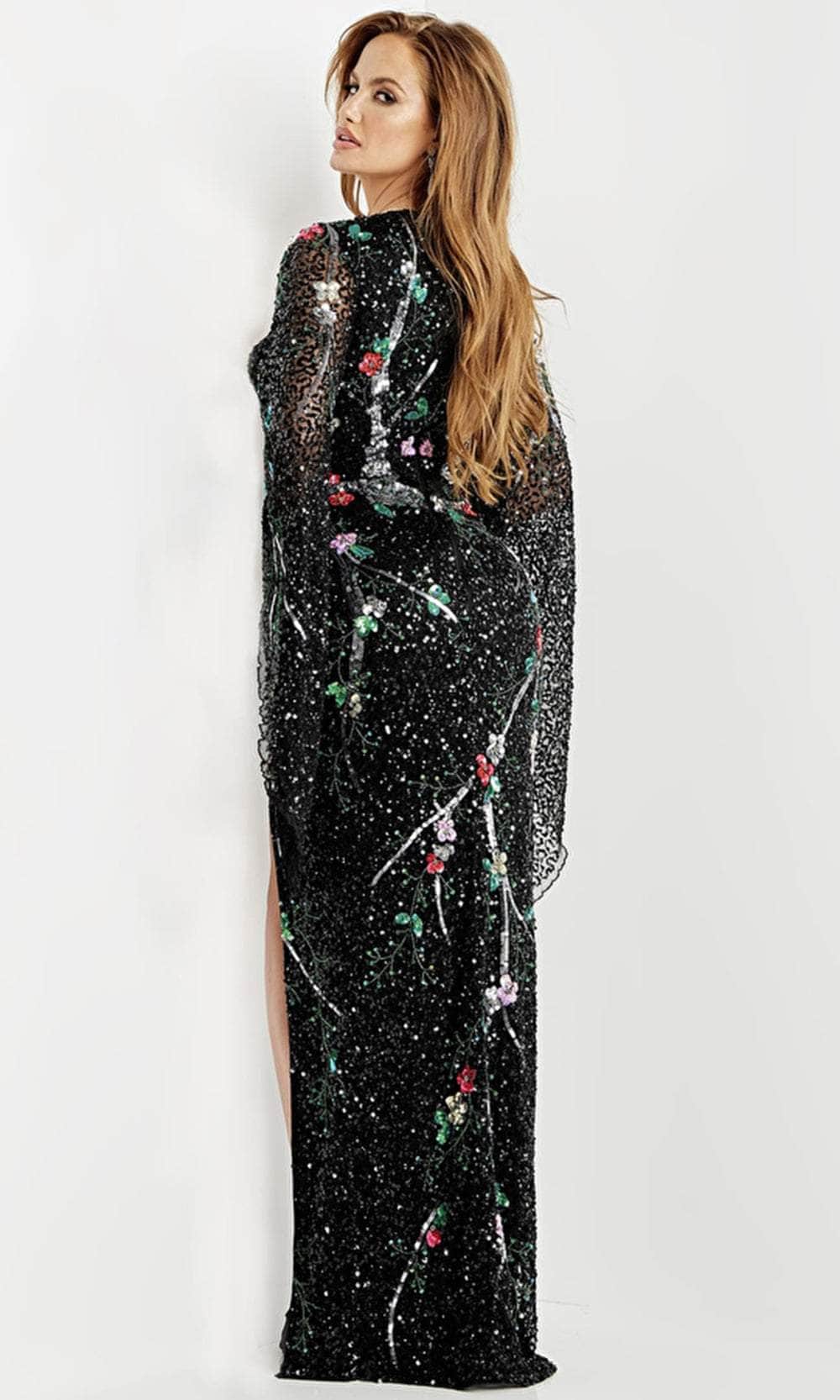 Look jaw dropping in this dramatic evening dress by Jovani 22713. This sexy evening dress features a fitted silhouette with a plunging V-neckline and full length draped sleeves and a floral sequin embroidered fabric that contains various patterns. The dress is finished with a high slit and a light train finish for that extra beauty. Give them a shot to show up like a diva at your most awaited occasion in this Jovani masterpiece. Model is wearing Black/Multi color.