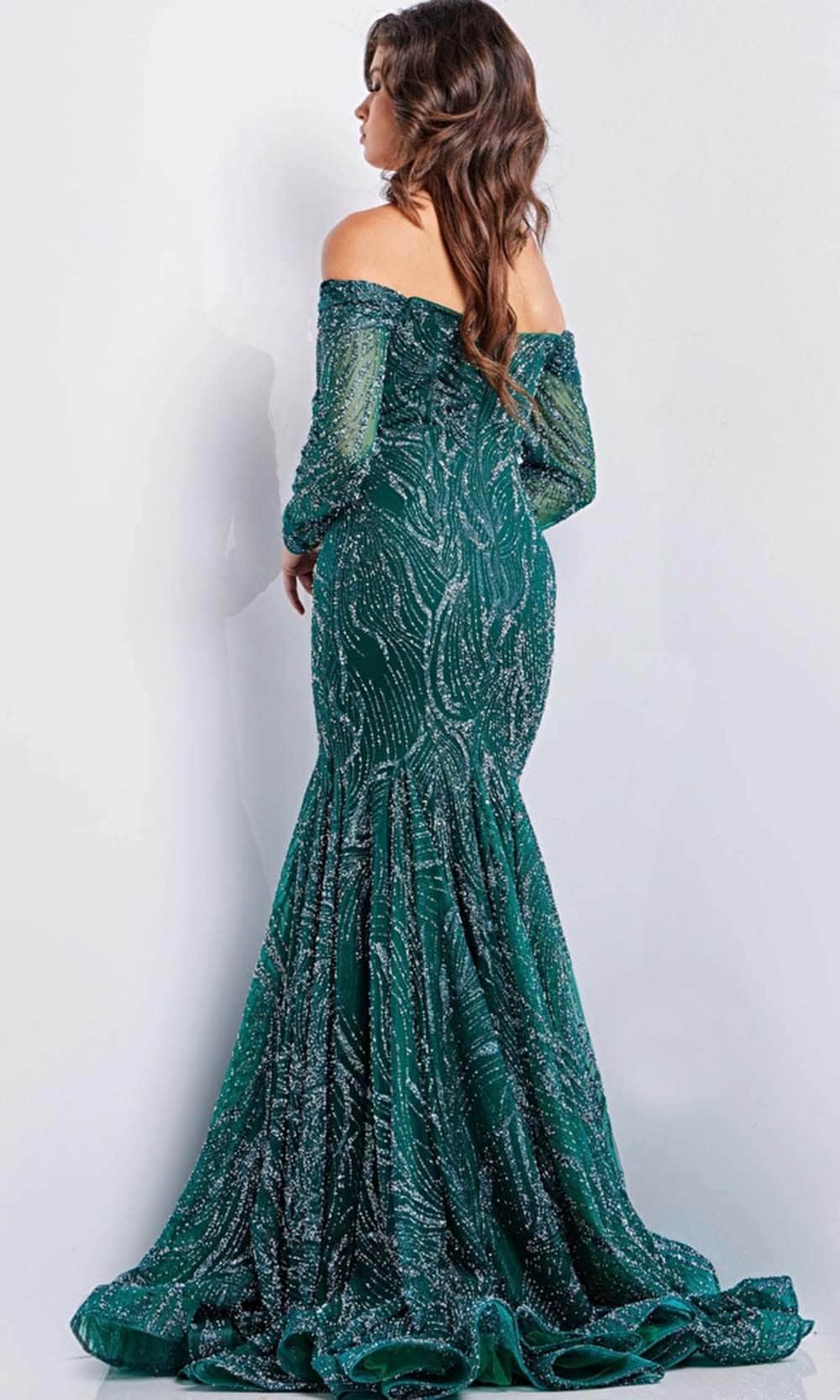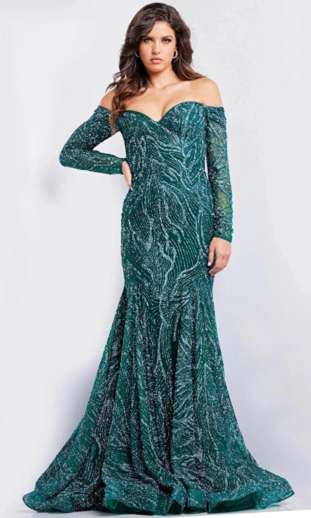 Be impressed by the mesmerizing appeal that shines when you don this Jovani 22858 creation. Artistically embellished with intricate beadwork tantalizingly ornamented its tailored length, this gown features a sweetheart neckline on an off shoulder bodice. Detailed with sheer long sleeves and coupled with a midrise styled back, this gown is fashioned on the trumpet skirt as it trails into a train. Look arresting in this highly chic in this Jovani 22858 masterpiece. Model is wearing the Green color.