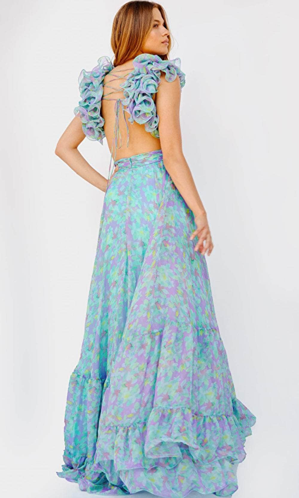 Bring a breathtaking new look to prom night in this stunning Jovani 23320 special occasion dress. This dress promises you a comfortable wear on any event. It offers a flowy A-line silhouette with a fabric fully printed with floral patterns. Presents in ruffled shoulder straps and styled with an exposed back closing itself with lace-up tied in crisscross. Finished with a sweep train and secured with zipper. Be ready to fascinate everyone with Jovani 23320. Model is wearing Print color.
