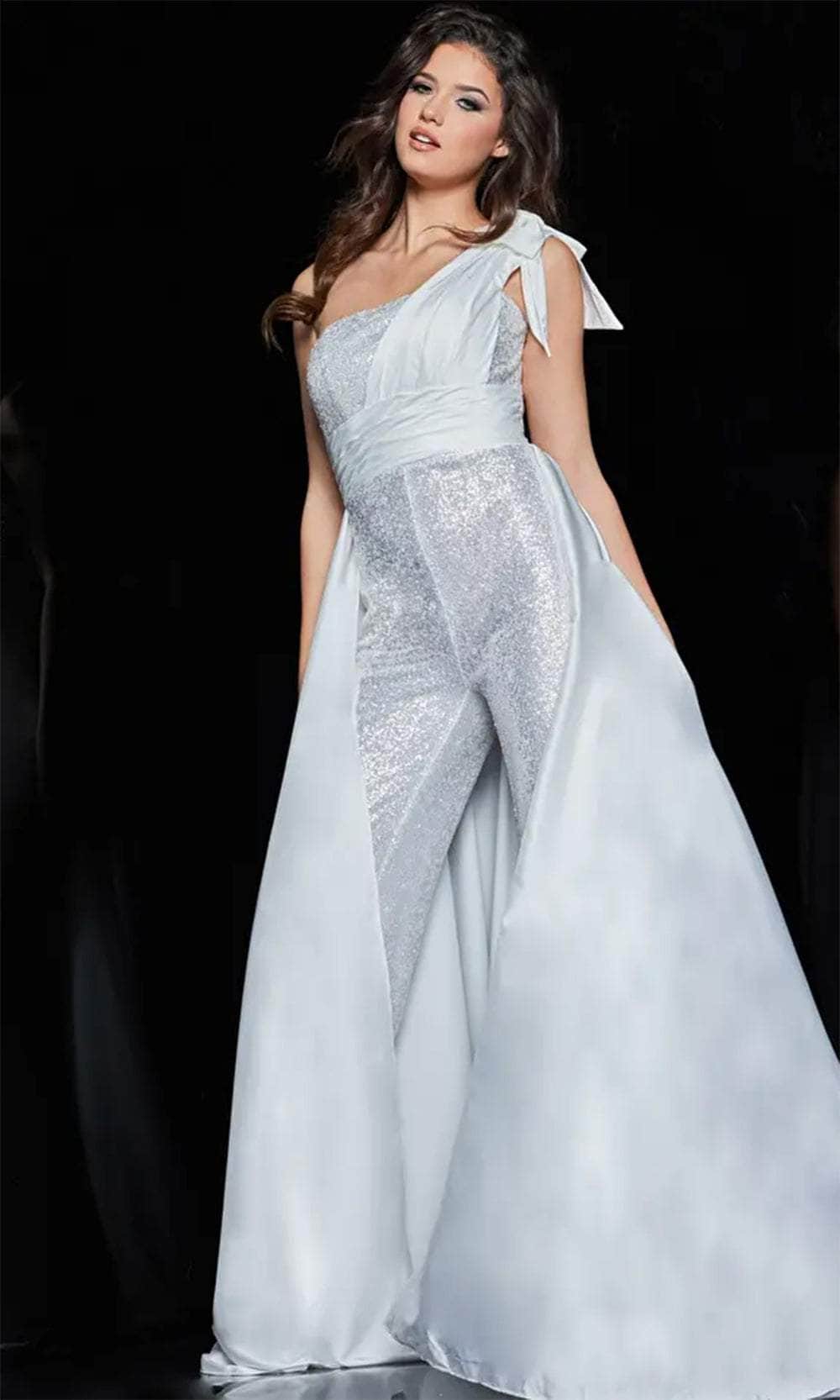 | Details: | One-Shoulder, Bow Tie, Fitted Bodice, Sequin Embellished, Over Skirt, Wide Leg Pants |