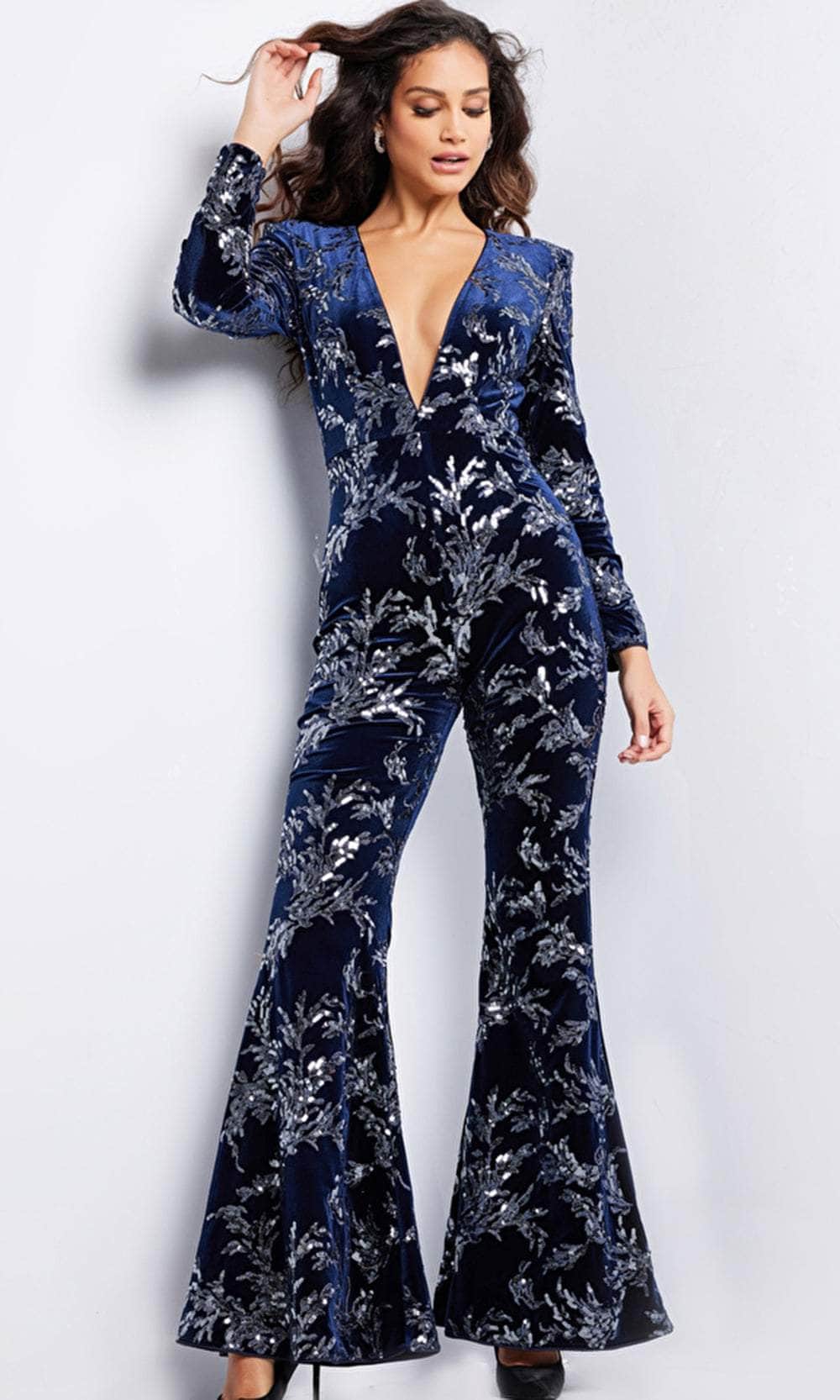 Savor the elegance with Jovani 23708, a stunning jumpsuit designed to captivate. The fitted bodice, adorned with sequin embellishments, highlights your curves elegantly. Long sleeves and a plunging V-neck add a touch of allure and sophistication. Completed with sleek straight-leg pants, this ensemble exudes modern glamour and style. Whether it's a special occasion or a night out, Jovani 23708 promises to make a memorable statement with its impeccable design and dazzling details. Model is wearing Navy color.