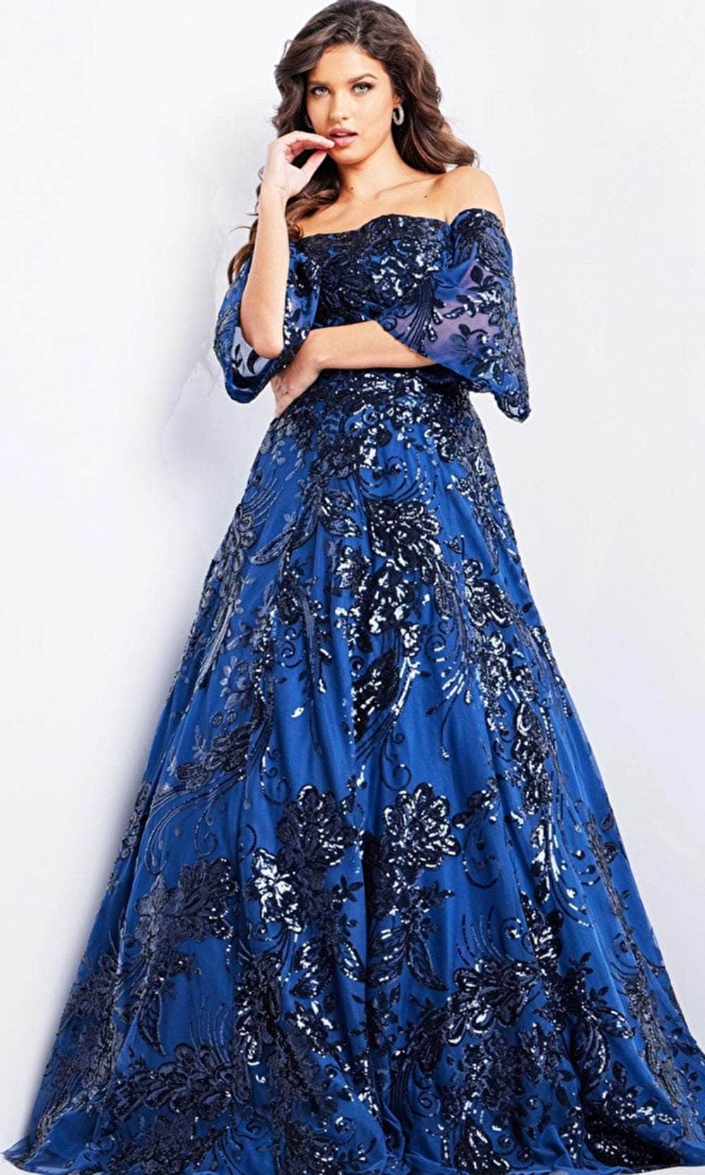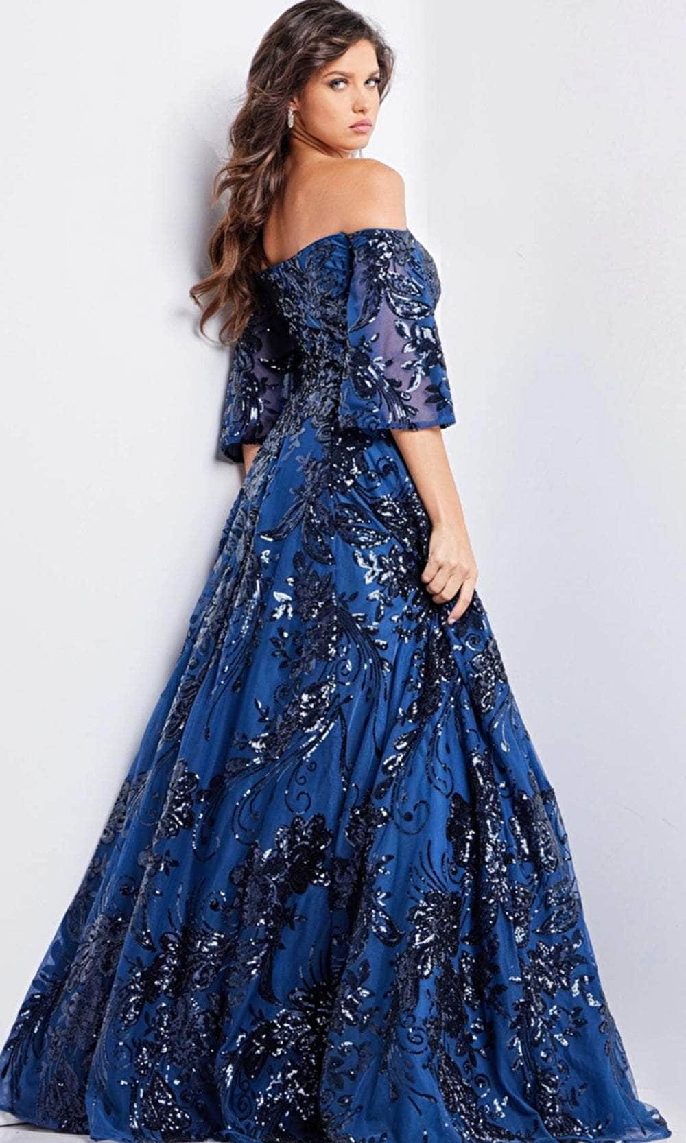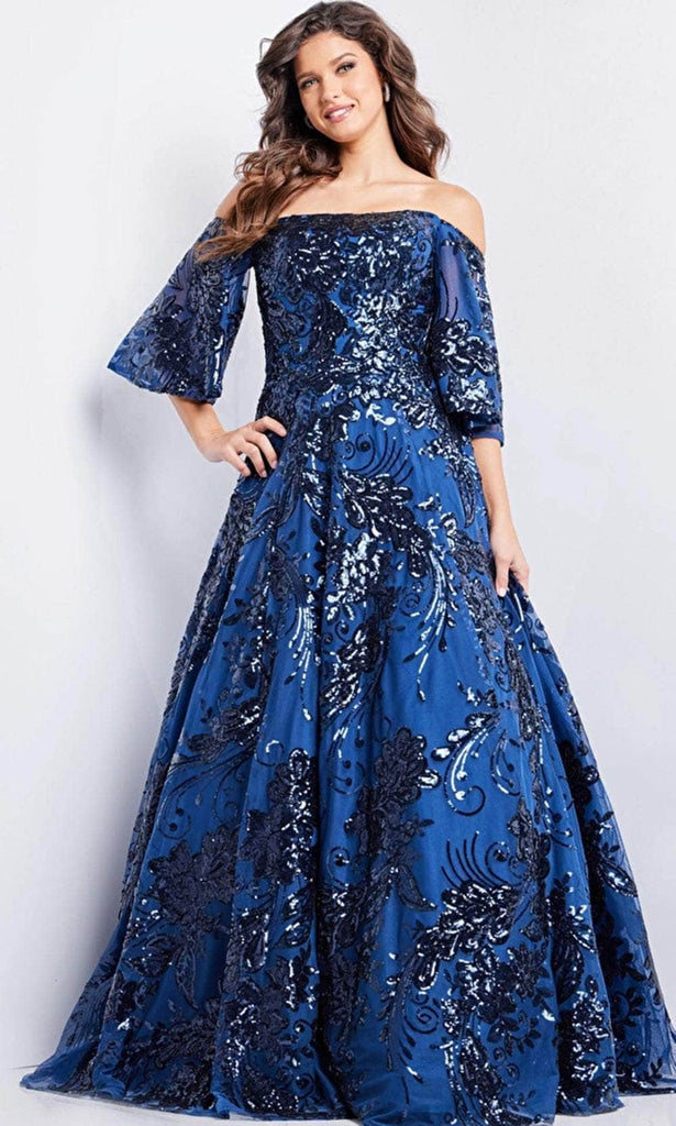 Embrace extravagance when you wear this stunning Jovani 23765 dress, which is embellished with tiny, shimmering sequins. The straight-across neckline and off-the-shoulder bodice scream modern beauty. Bell sleeves give the outfit a romantic touch. The A-line silhouette skirt falls softly to the floor, giving the ensemble a classic and enchanted appearance, while the back zipper fastening guarantees a flawless fit. The Jovani 23765 is an excellent option for individuals who want to create a striking and remarkable event. Model is wearing Navy color.