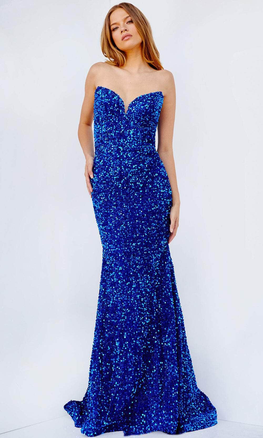 Step into a realm of sophistication with the Jovani 23771 prom dress, a stunning representation of modern elegance. This intricately tailored gown beautifully contours the feminine form, creating an enchanting silhouette. Featuring a captivating strapless sweetheart neckline, the fitted bodice transitions gracefully into a flowing floor-length design. The standout sequin beaded bodice adds a touch of opulence, making this mermaid gown perfect for leaving a lasting impression at any occasion. Choose the Jovani 23771 for your prom night and experience a perfect blend of allure and refinement. Models are wearing the Black and Royal colors.