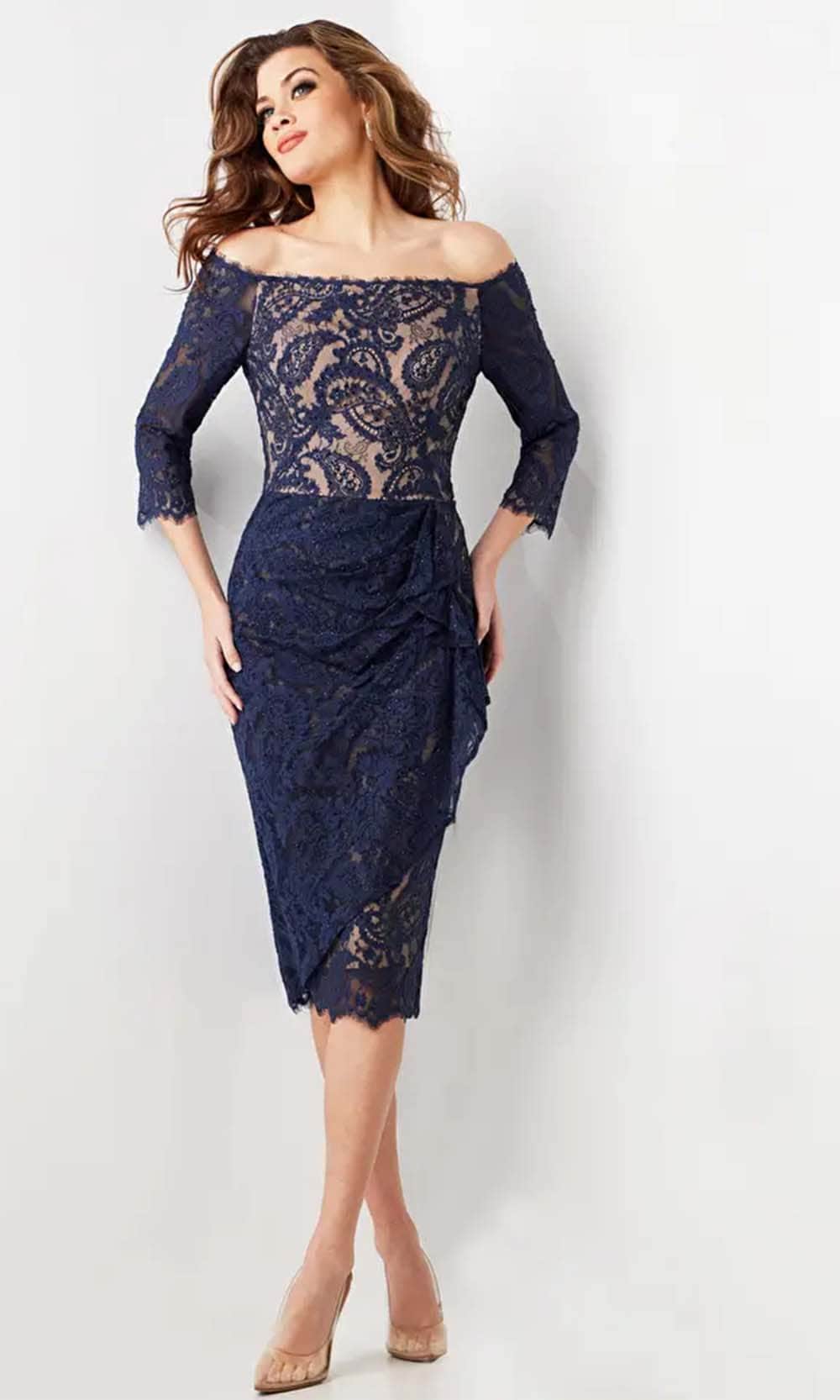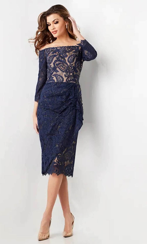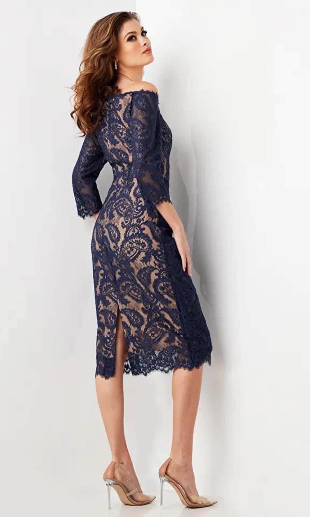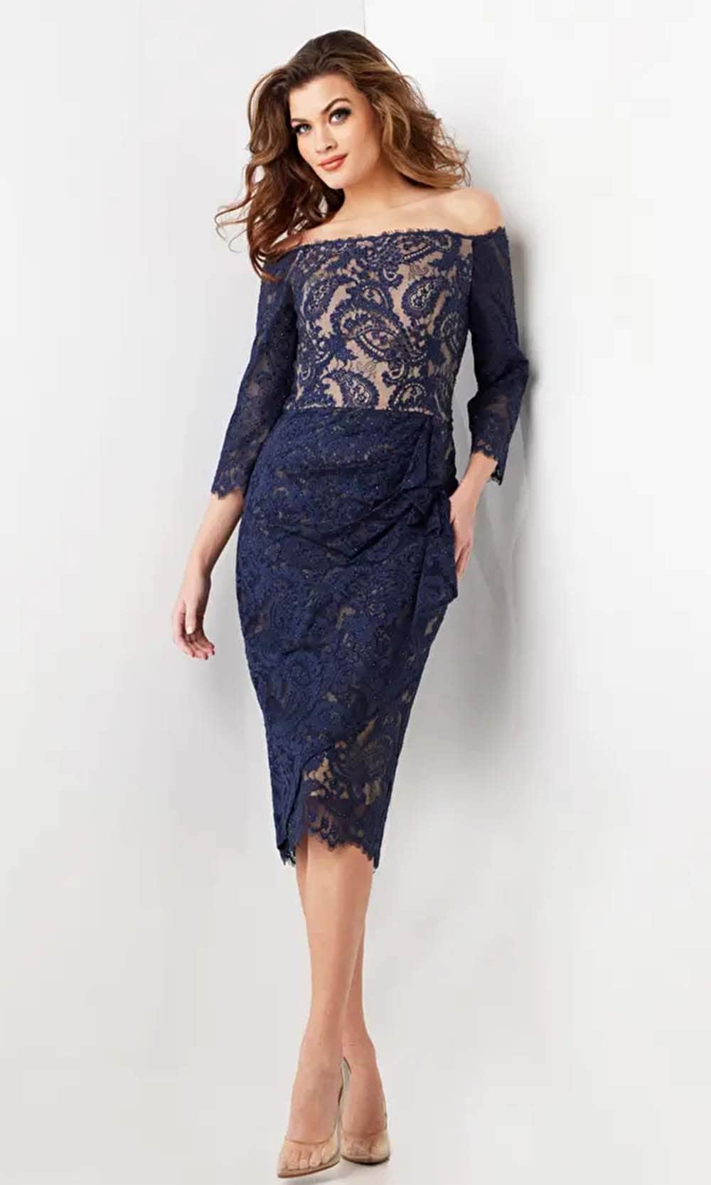 Wear Jovani 23814, crafted from delicate lace fabric to project confidence. Its off-shoulder fitted bodice boasts a timeless straight-across neckline, elegantly framed by quarter sleeves. A center zipper closure adorns the mid-open back, ensuring a secure fit. The knee-length skirt gracefully flows in a flattering sheath silhouette, accentuated by a chic back slit. With its refined design and classic silhouette, Jovani 23814 is the epitome of elegance, perfect for any special occasion. Model is wearing Navy color.