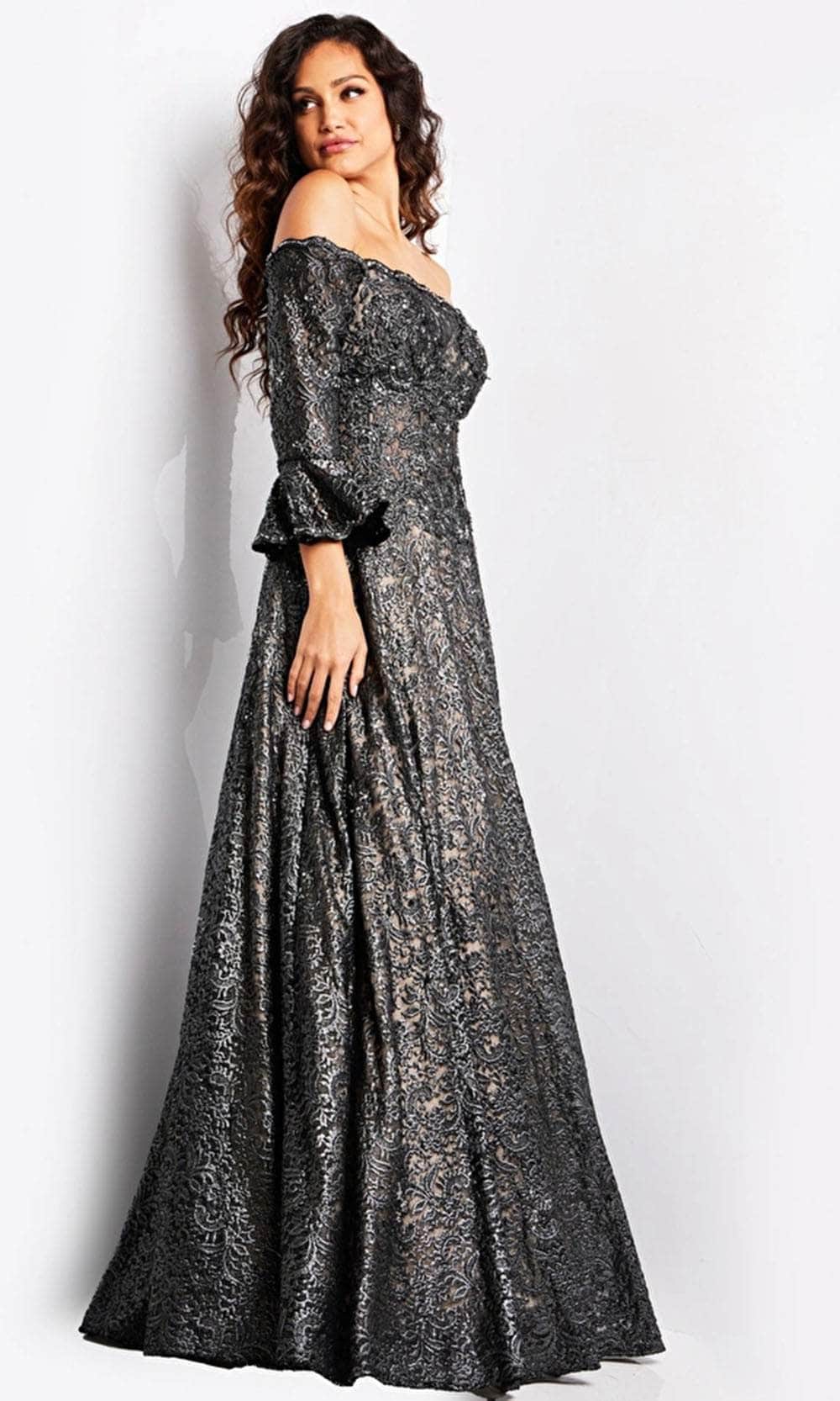 Captivate in Jovani 23936, an off-shoulder dress adorned with enchanting embroideries. The corset bodice ensures a flattering fit, complemented by a timeless straight-across neckline. Long sleeves add a touch of sophistication, creating a harmonious blend of allure and elegance. The floor-length A-line silhouette skirt gracefully flows, completing this ensemble with a sense of grace and style. Perfect for making a statement at any formal event, this Jovani 23936, is a flawless choice for those seeking timeless and captivating attire. Model is wearing Gunmetal color.