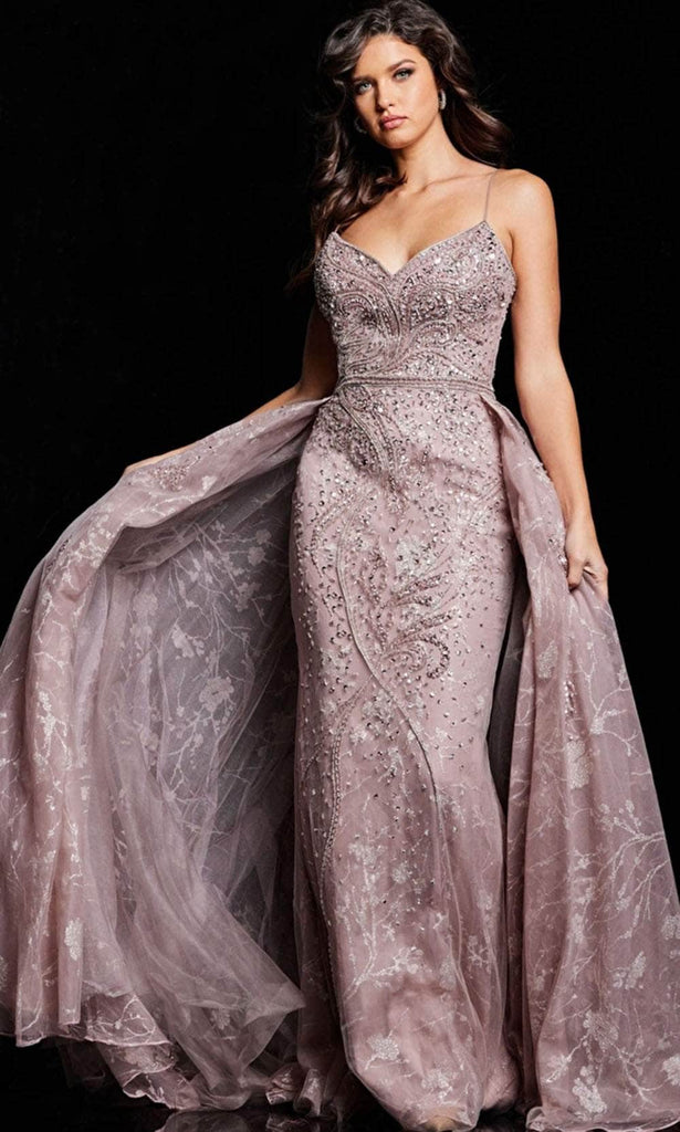 Sparkle and amaze everyone in this Jovani 24001, a sleeveless dress adorned with sparkling beads for a radiant allure. The fitted bodice and V-neckline exude sophistication, complemented by delicate spaghetti straps. The mid-open back, secured with a center zipper closure, adds a modern touch. The floor-length column silhouette skirt is elegantly enhanced with an overskirt, creating a stunning and dynamic look that cascades into a sweeping train. This Jovani 24001 is perfect for those who seek a blend of glamour and timeless elegance on any special occasion. Model is wearing Taupe color.