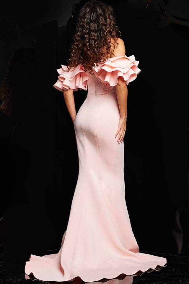 Enter the spotlight wearing Jovani 24280 evening gown, a mermaid silhouette made of scuba material that enhances your curves. Luxurious ruffled off-shoulder straps add elegance, while the sweeping train exudes grace and grandeur. With its regal straight neckline and floor-length hemline, this garment is ideal for a black-tie event and promises to make a lasting impression. The model is pictured wearing the Blush variant.