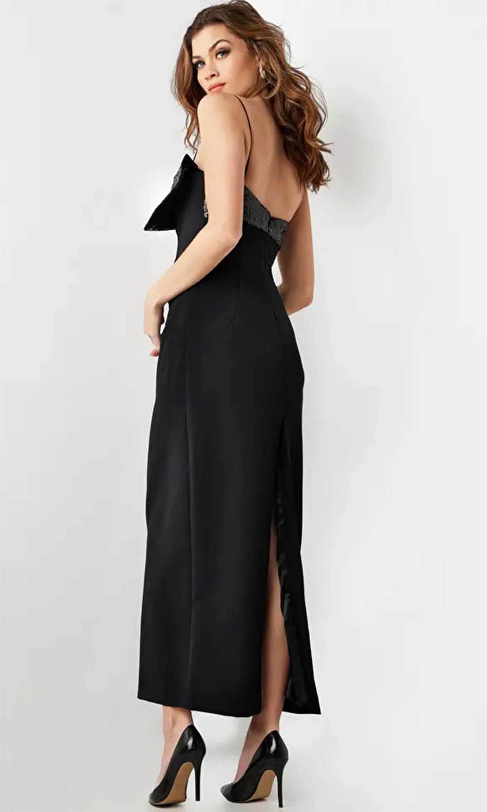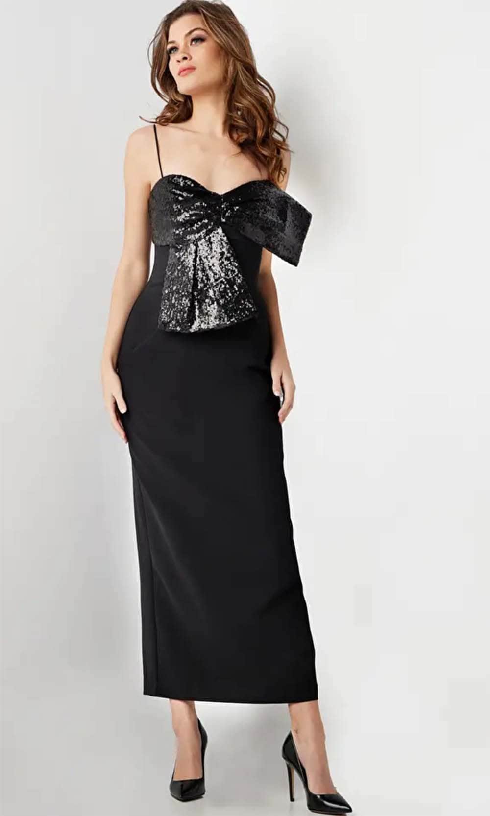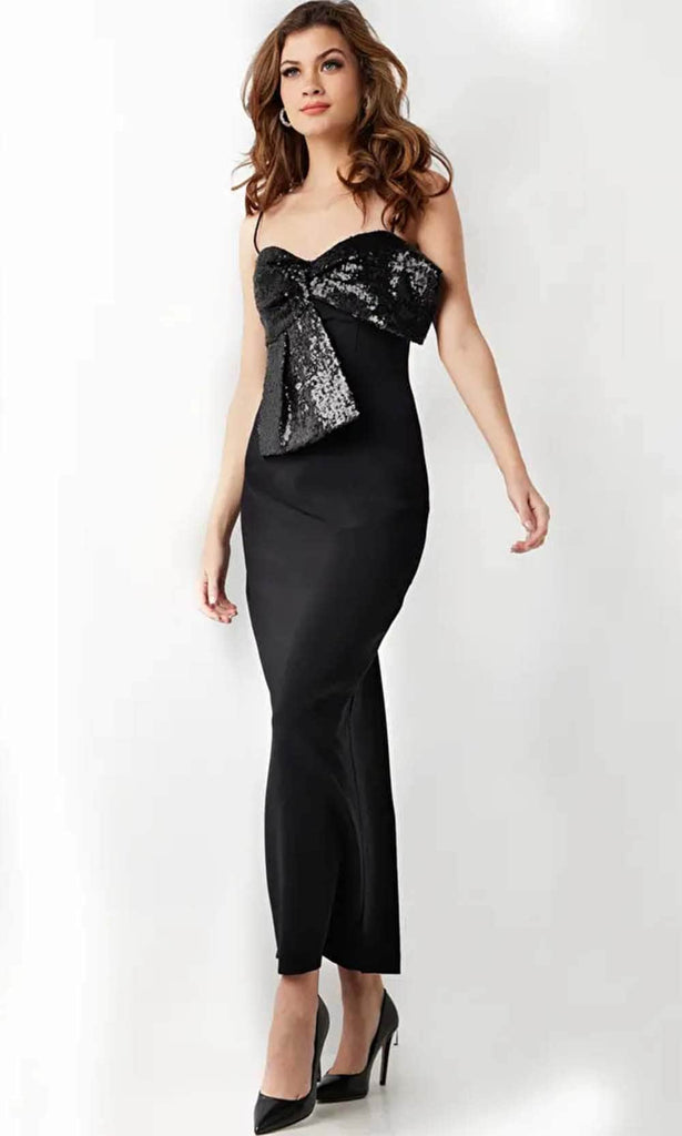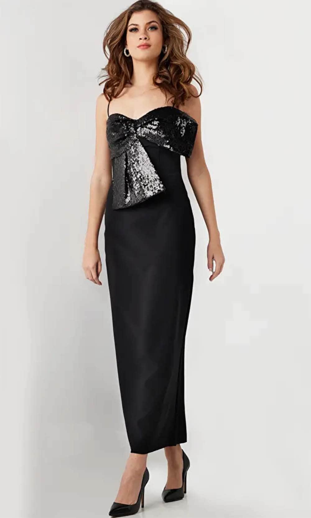 Enter sophistication with Jovani 25745, a delightful dress that enchants from every angle. Its sleeveless fitted bodice highlights a sweetheart neckline adorned with glistening sequins in a charming bow-style motif. Secured by a center zipper closure at the back, it ensures a flawless fit. The tea-length skirt cascades elegantly in a flattering sheath silhouette, elevated by a chic back slit. With its intricate embellishments and contemporary silhouette, Jovani 25745 is ideal for any memorable occasion. Model is wearing Black color.