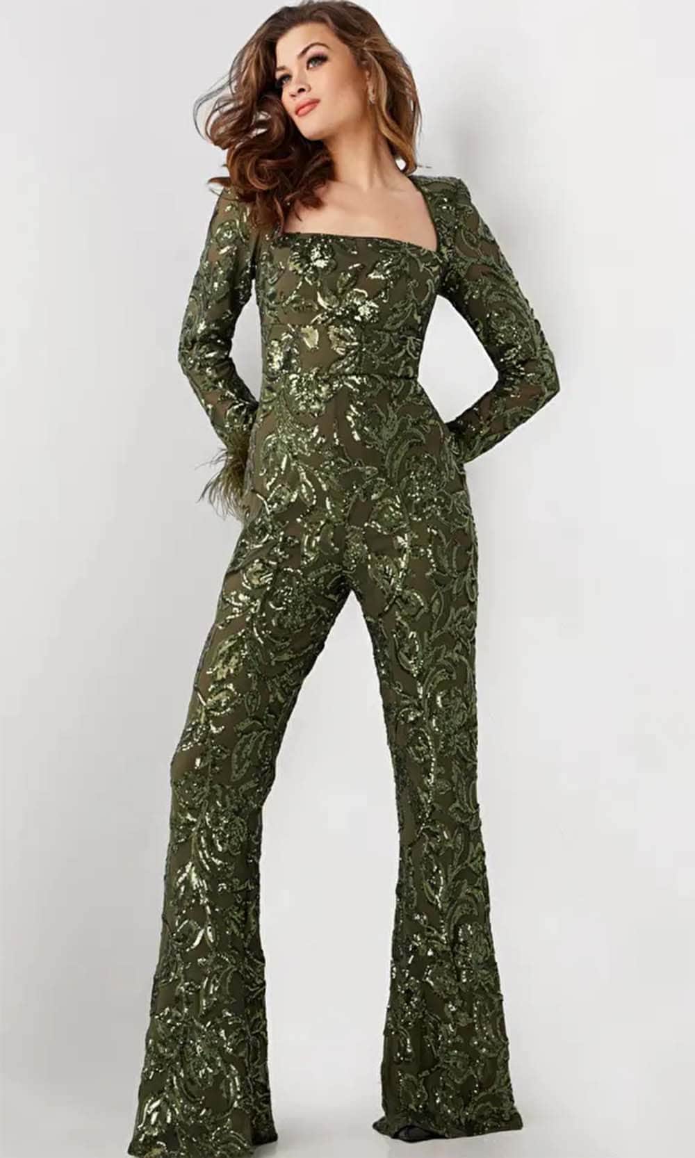 Shine as you wear this captivating Jovani 25904, a dazzling jumpsuit that commands attention. Adorned with sparkling sequins, its fitted bodice features a chic square neckline for a modern touch. Long sleeves, delicately embellished with feathers at the cuff, add an air of elegance. Completing the ensemble, the floor-length wide-leg pants offer both sophistication and comfort. With its glamorous details and contemporary design, Jovani 25904 is the perfect choice for making a bold statement on any special occasion. Model is wearing Olive color.