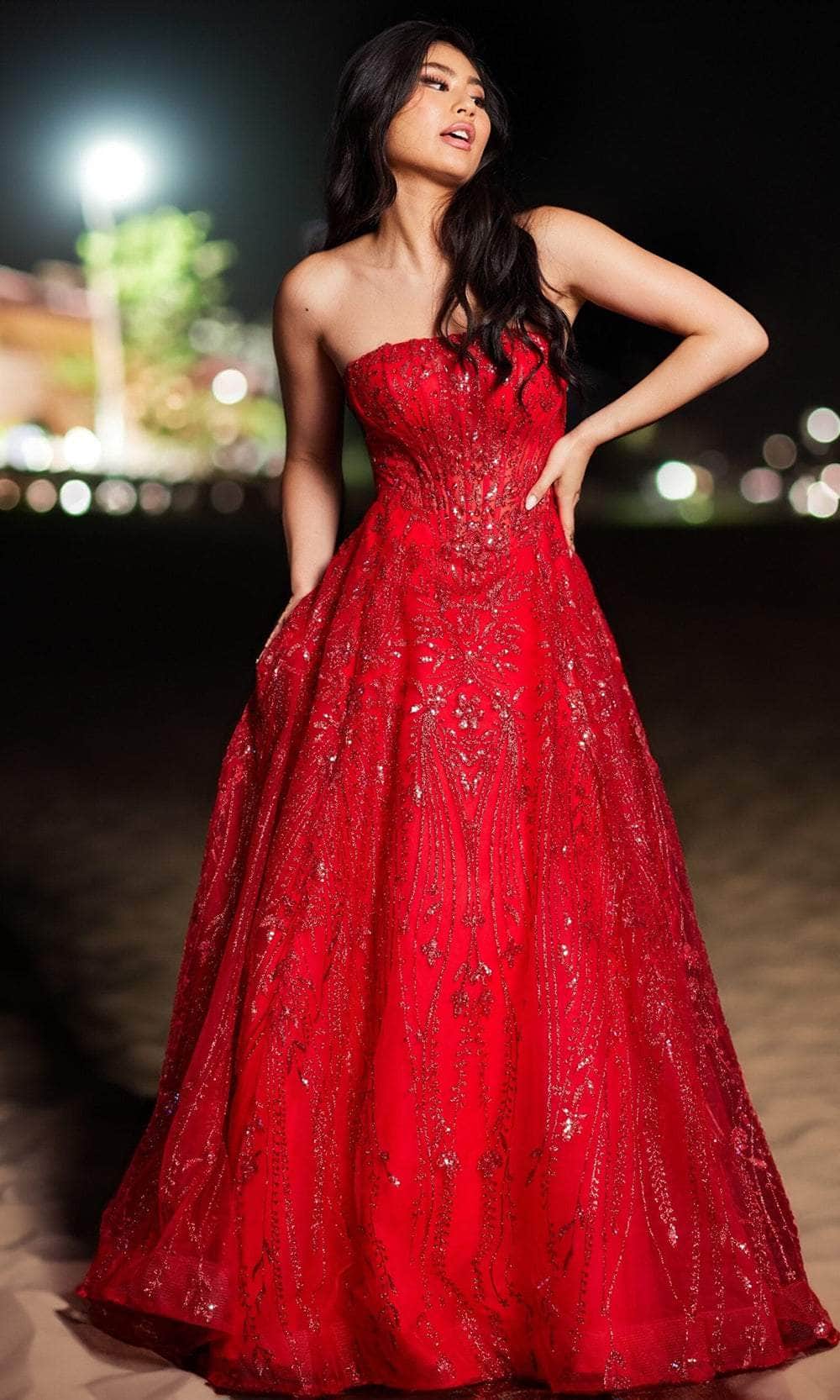 Make a grand entrance at prom in this Jovani 26109 masterpiece. Crafted from luxurious tulle fabric, this gown displays a strapless design and a straight-across neckline that exudes timeless glamour. The corset bodice offers a structured fit, complemented by a mid-open back secured with a discreet zipper closure. The skirt cascades elegantly to the floor, shaping a ballgown silhouette that radiates princess-like charm. Prepare to make an unforgettable impression in this Jovani 26109 gown. Model is wearing Red color.