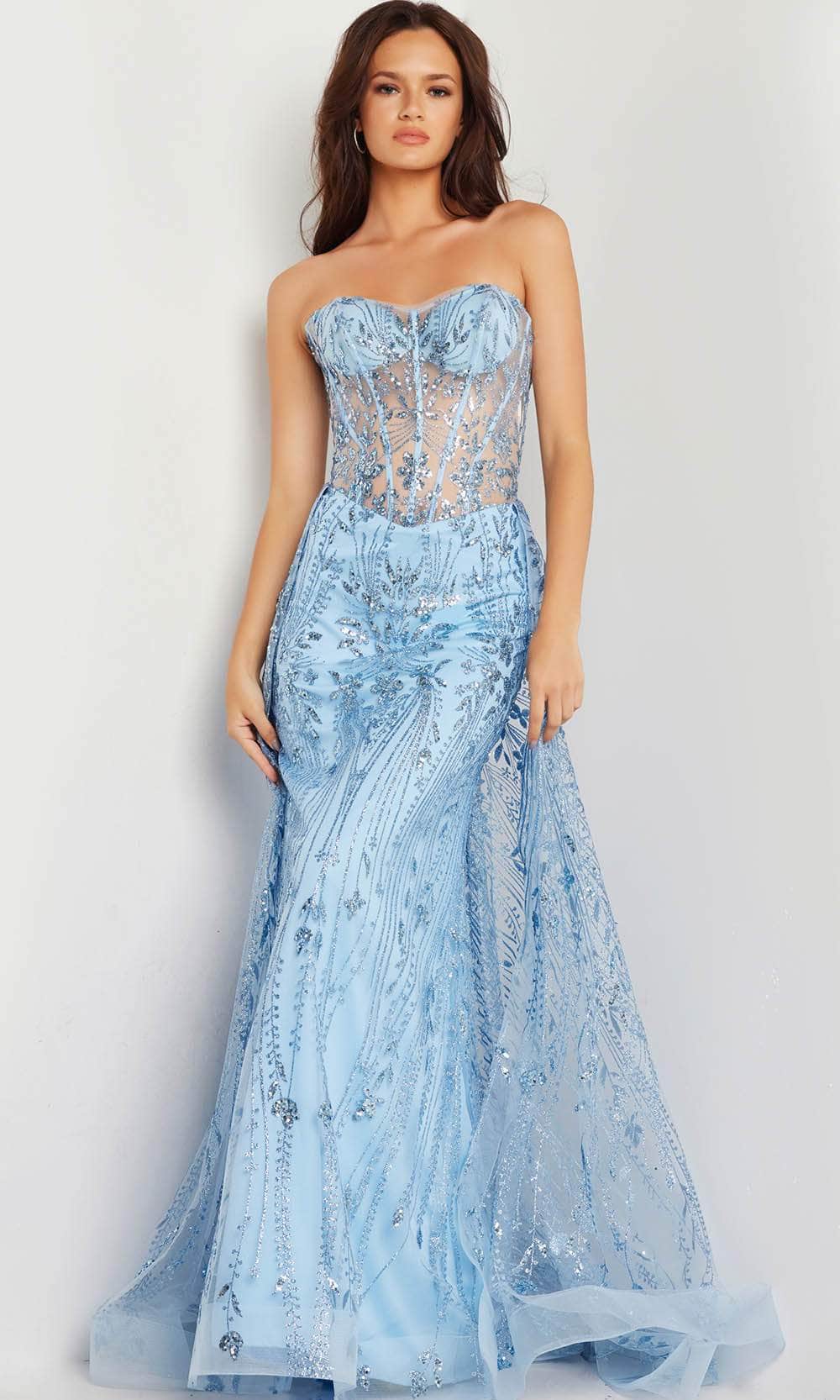 Make it a moment to shine in this Jovani 26113 gown. Adorned with an elaborate pattern of glitters and sequins, this strapless ensemble makes you sparkle with every move you take. It shows a sweetheart neckline, and illusion corset bodice with boning detail for a flawless fit. The mesmerizing A-line overskirt flows gracefully to the sweeping train and ends with horsehair trim. The full-length sheath skirt completes this beautiful look. This Jovani 26113 masterpiece is the perfect choice for an unforgettable prom night. Model is wearing the Light-Blue color.