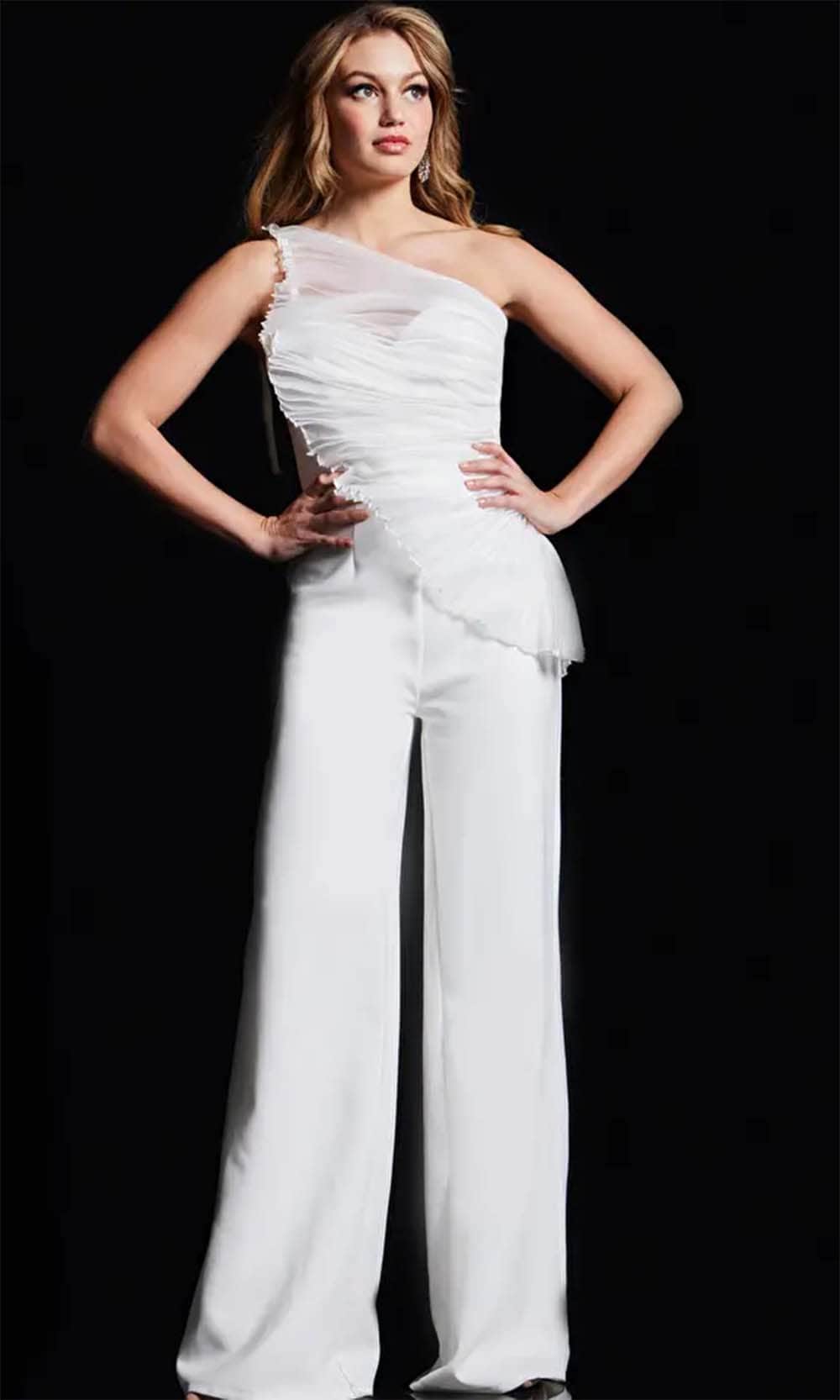 Every component of the enchanting Jovani 26171 will make a chic statement. A stylish jumpsuit designed to impress. Its one-shoulder fitted bodice features a flattering ruched tulle design, accentuated by an asymmetrical neckline for added allure. The ensemble is completed with floor-length wide-leg pants, offering both sophistication and comfort. With its modern silhouette and elegant detailing, Jovani 26171 is the perfect choice for making a fashionable statement on any special occasion. Model is wearing White color.