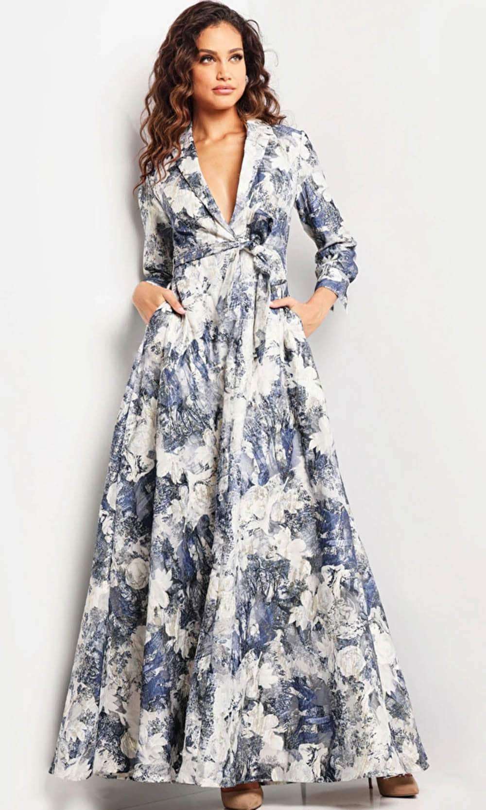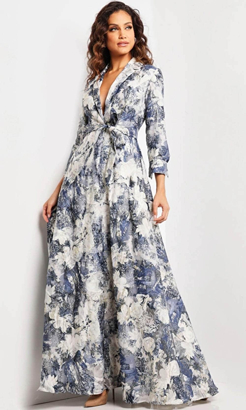 Dance the night away without a care in Jovani’s 26202! Revel in the charm of this show-stopping A-line dress, adorned with a delightful floral print that graces the elegant V-neckline and long sleeves. The knot waist adds a touch of sophistication, while the enclosed back and sweep train contribute to a sleek silhouette, putting a unique twist on a classic look. With Jovani 26202, embrace a style that allows you to spin and twirl in unparalleled elegance and grace! Model is wearing Print color.