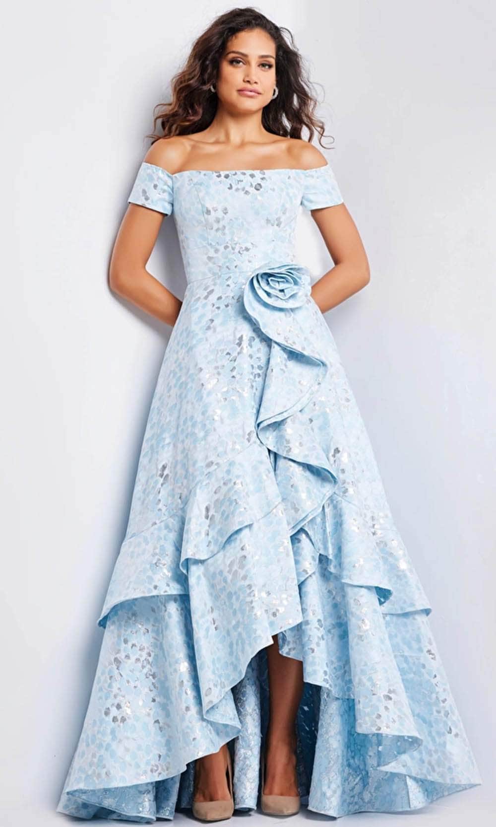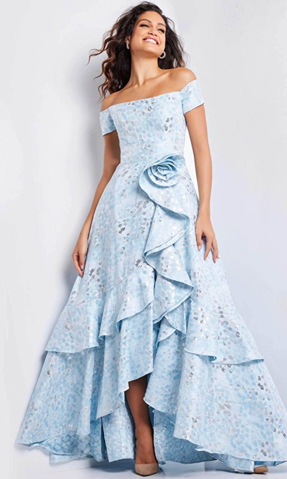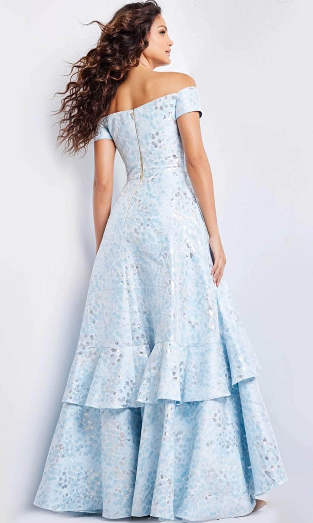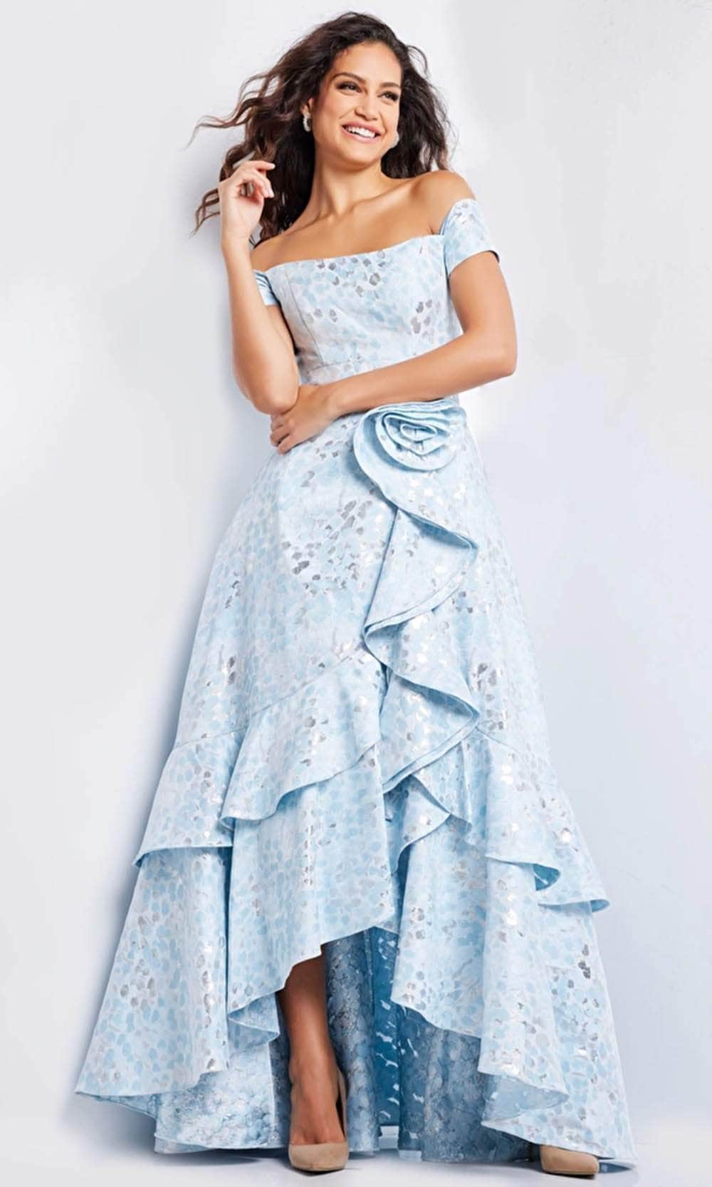 Get ready for a truly unforgettable evening event in this Jovani 26256 masterpiece. With its mesmerizing brocade fabric, this ensemble showcases an off-shoulder straight across neckline and short sleeves. As you turn, the back has straight mid-open detail and zipper closure at the center. The ruffles cascading from the center waist down to the hemline bring movement and an air of charm. The A-line skirt finishes in a tiered design and high low hem. Be beautiful in this stylish Jovani 26256 gown. Model is wearing the Light-Blue color.