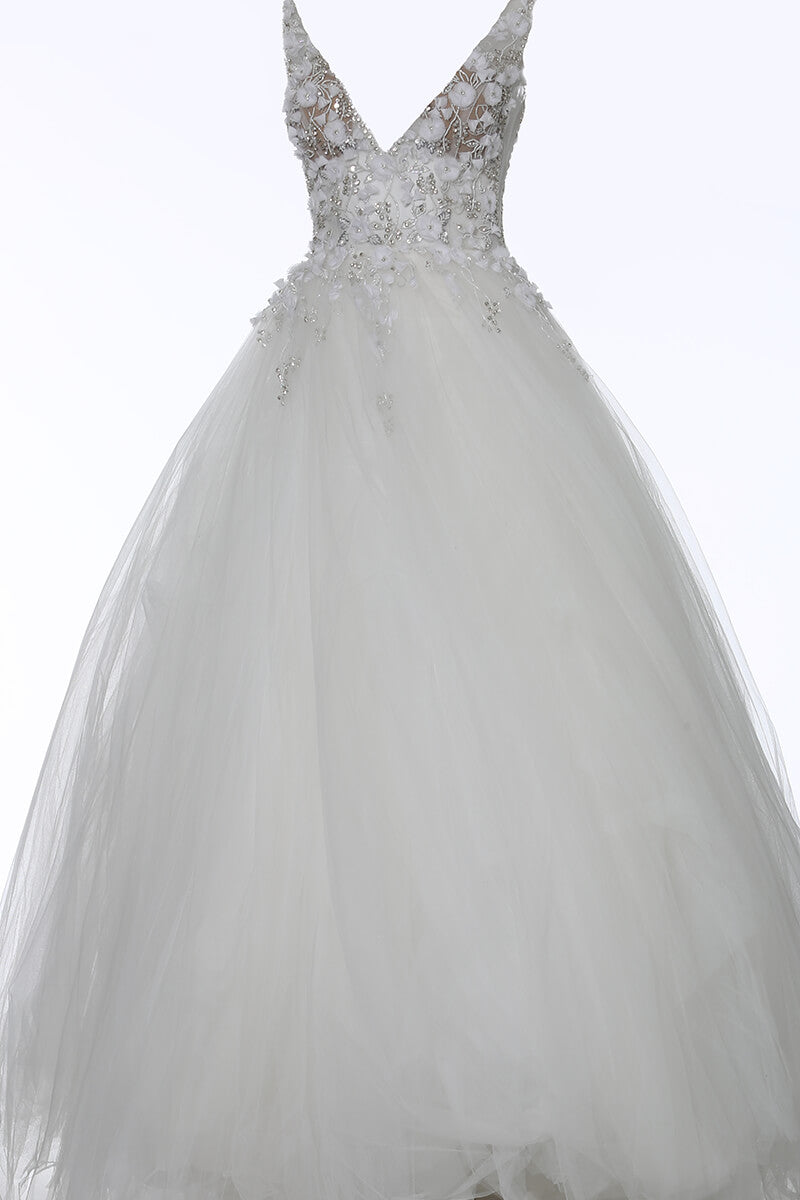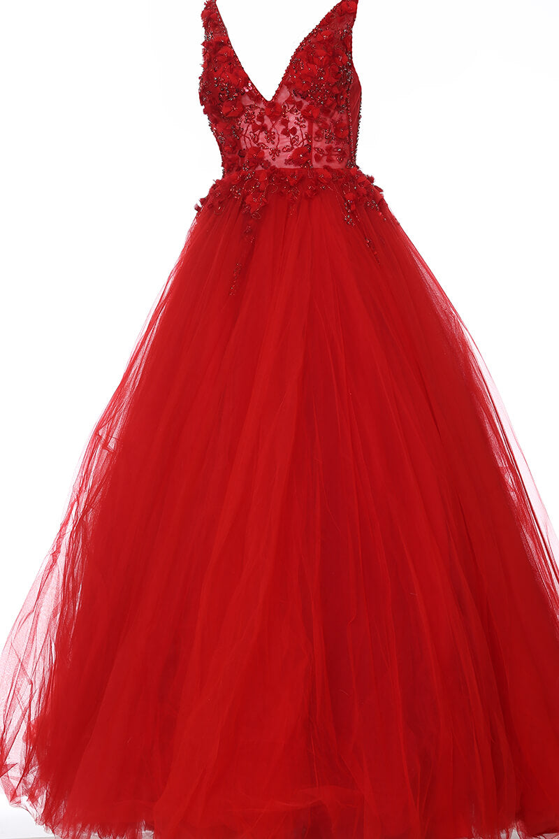 | Details: | Sleeveless, Plunging neckline, Tulle, Floral embellishments, Ballgown skirt, Sheer sides |