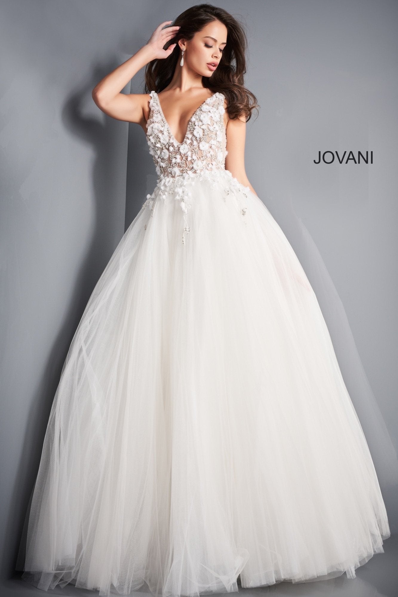 Wow the crowd as you saunter in this chic gown by Jovani 3110. Features a sleeveless, deep V-neckline with fitted bodice styled with floral appliques and sheer side panels. The tulle skirt flourishes a voluminous ballgown silhouette. This Jovani gown will make sure you turn heads all night long. Dress is pictured in Blue, Ivory, and Red colors.