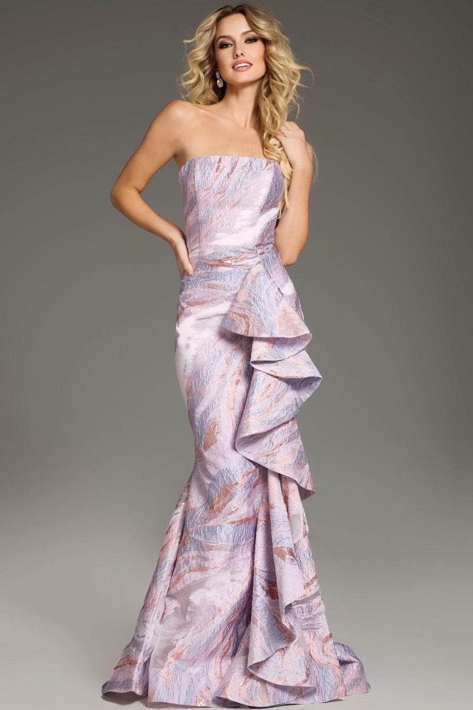 Experience the outstanding effect with this Jovani 31137, a magnificent mermaid gown that epitomizes elegance and sophistication. This exquisite dress features a strapless neckline designed to highlight the shoulders and collarbone, creating a timeless and graceful look. The full-length silhouette is impeccably fitted through the bodice and hips, flaring out dramatically at the knees with cascading ruffles that add a touch of drama and movement. Crafted from luxurious textured fabric, this Jovani 31137 offers an opulent look perfect for any formal occasion, ensuring you leave a lasting impression. Model is wearing Pink Multi color.