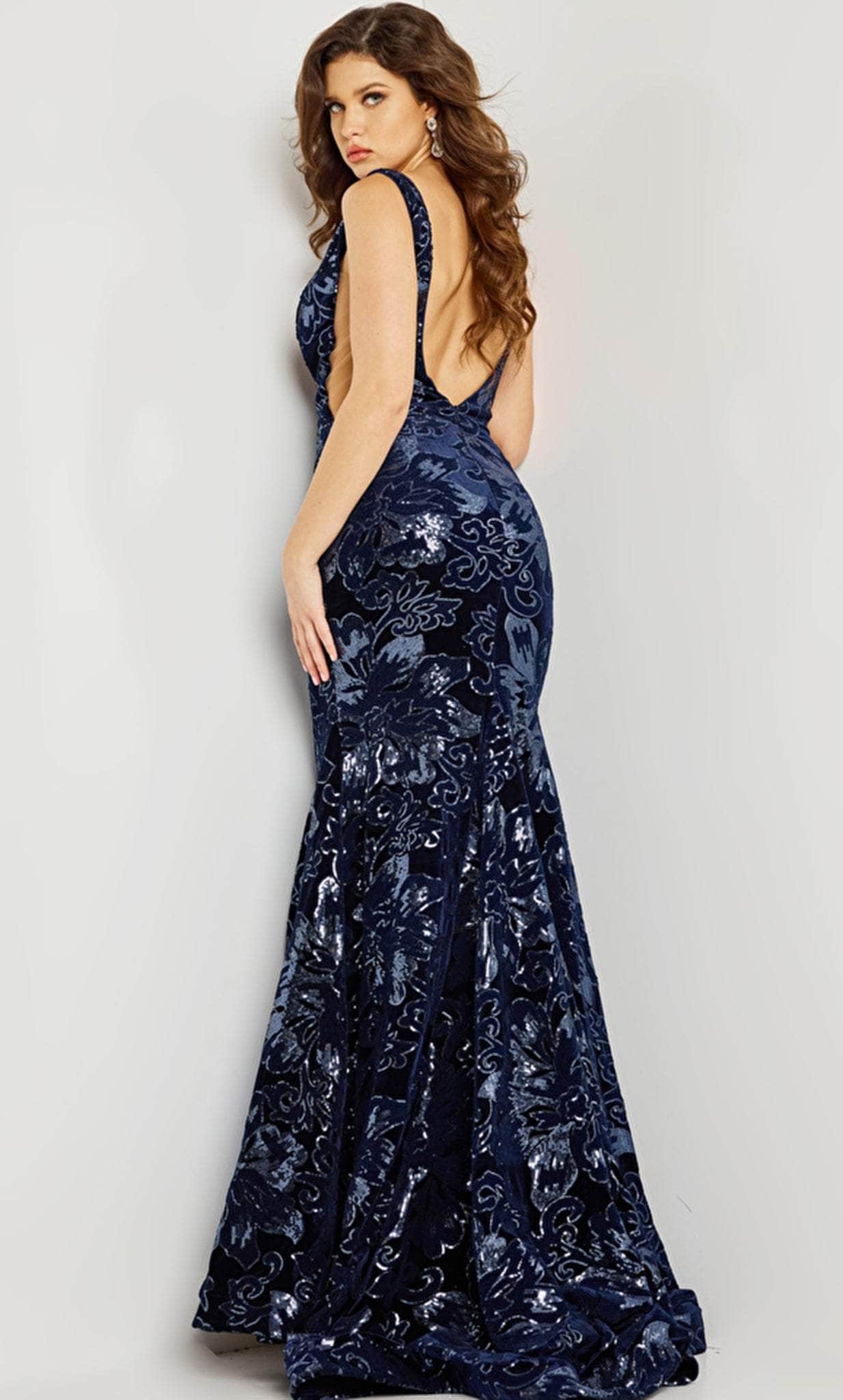 Feel glamourous in this lovely Jovani 32581 evening gown that will make you look refined. The shimmering sequined and cutout details of the back and sheer side panels will make you the center of attention at any party. The dual thick straps are both functional and aesthetically pleasing while the A-line silhouette is extremely figure-flattering and gives the wearer an air of effortless elegance. Turn yourself into a head-turning sensation by slipping into this utterly fetching Jovani 32581 creation! Model is wearing Navy color.