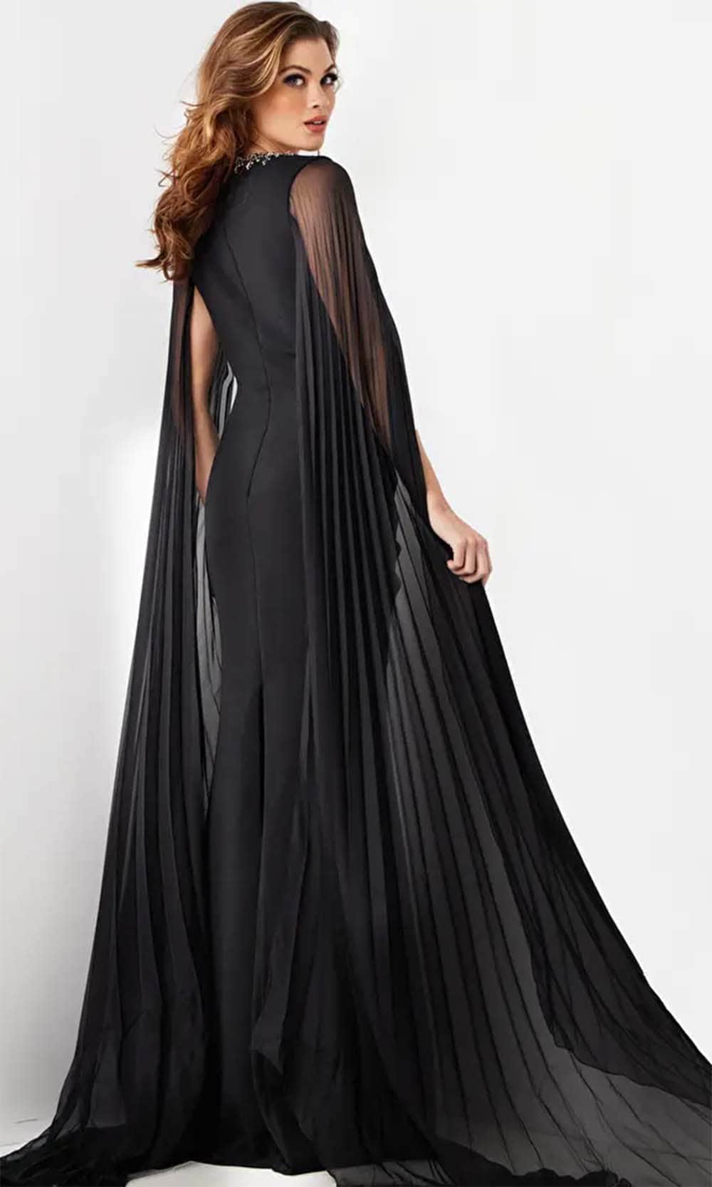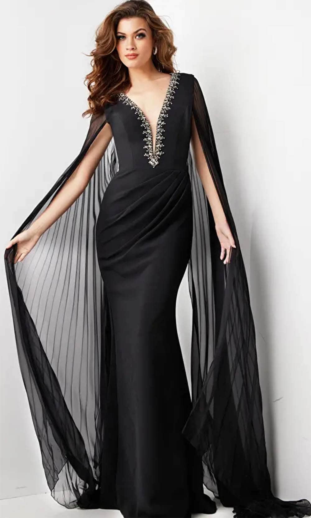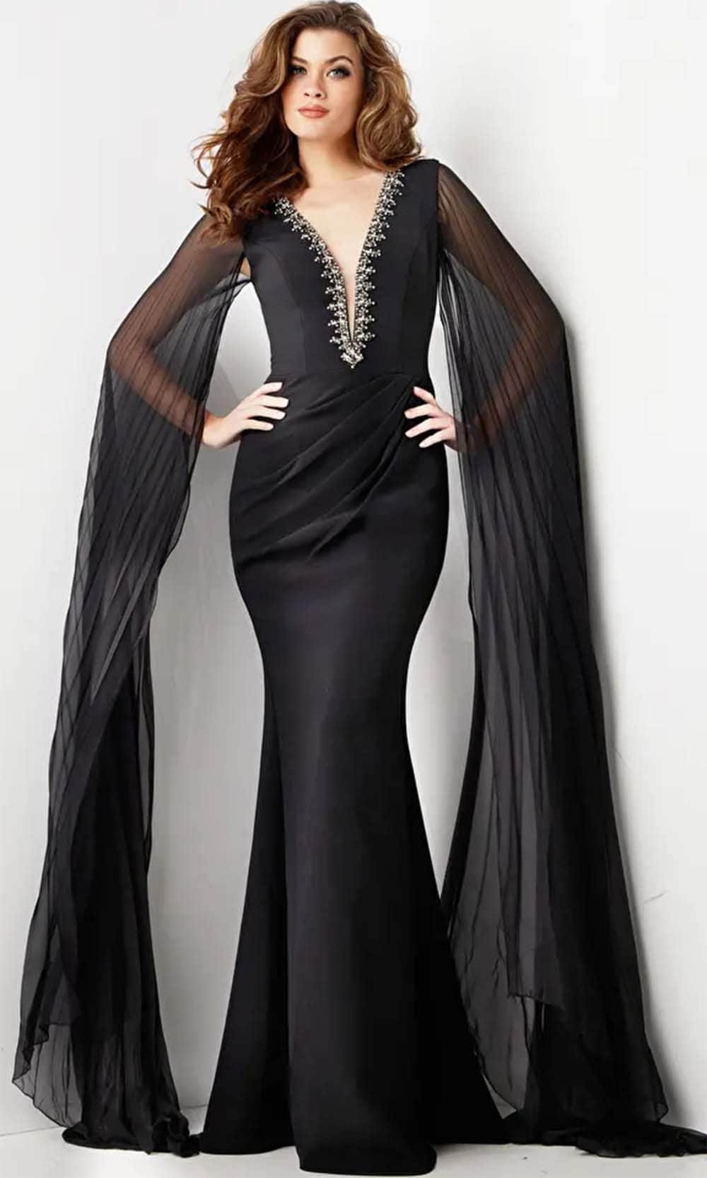 Unleash your inner enchantress with Jovani 36473, a stunning dress designed to captivate. Its fitted bodice boasts a plunging V-neckline adorned with sparkling rhinestones and a sheer insert, adding allure and elegance. The full-back is secured with a center zipper closure for a flawless fit. The floor-length skirt cascades gracefully in a sheath silhouette, finished with a train for added drama. Completing the ensemble, cape sleeves cascade beautifully to the floor, Jovani 36473 ensures a memorable entrance at any formal occasion. Model is wearing Navy color.