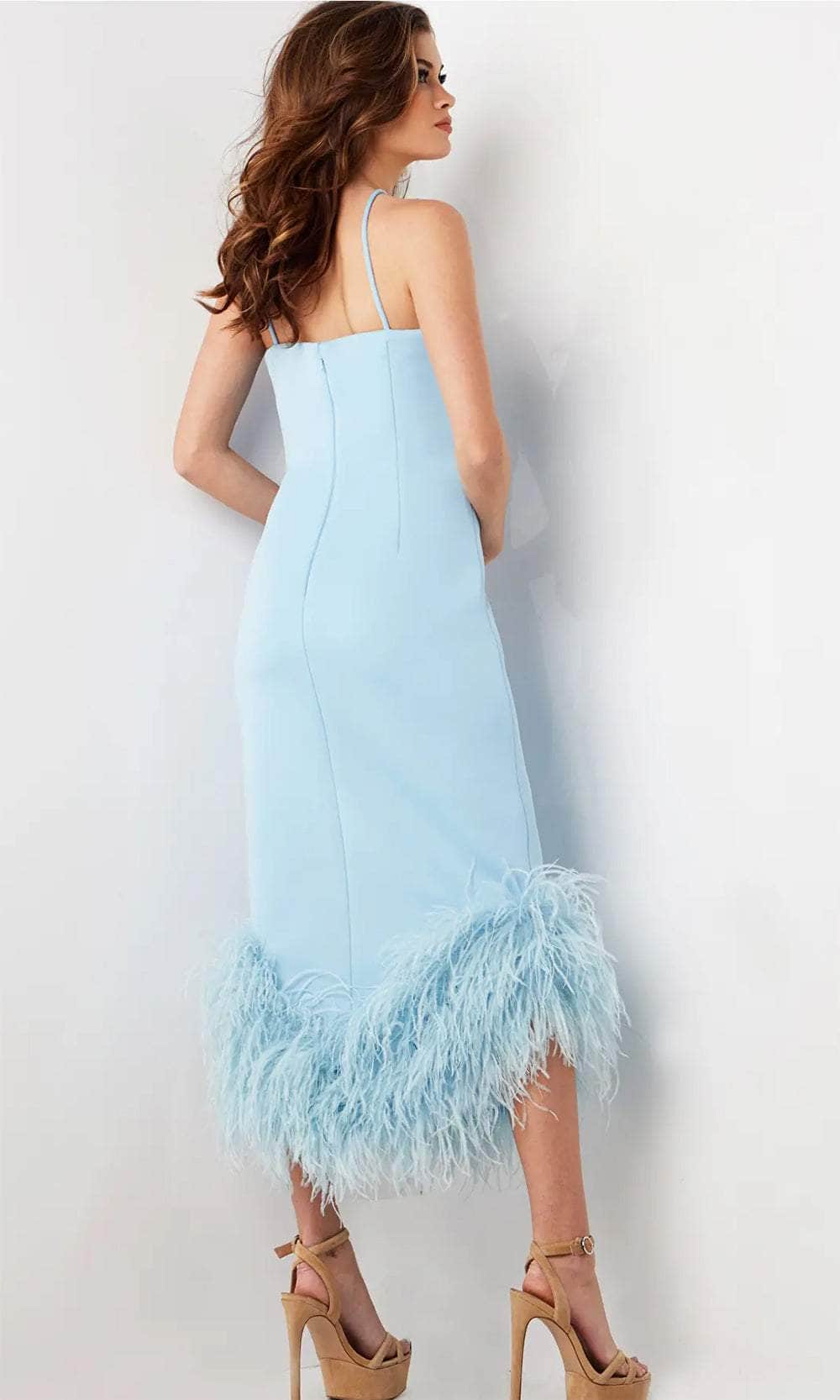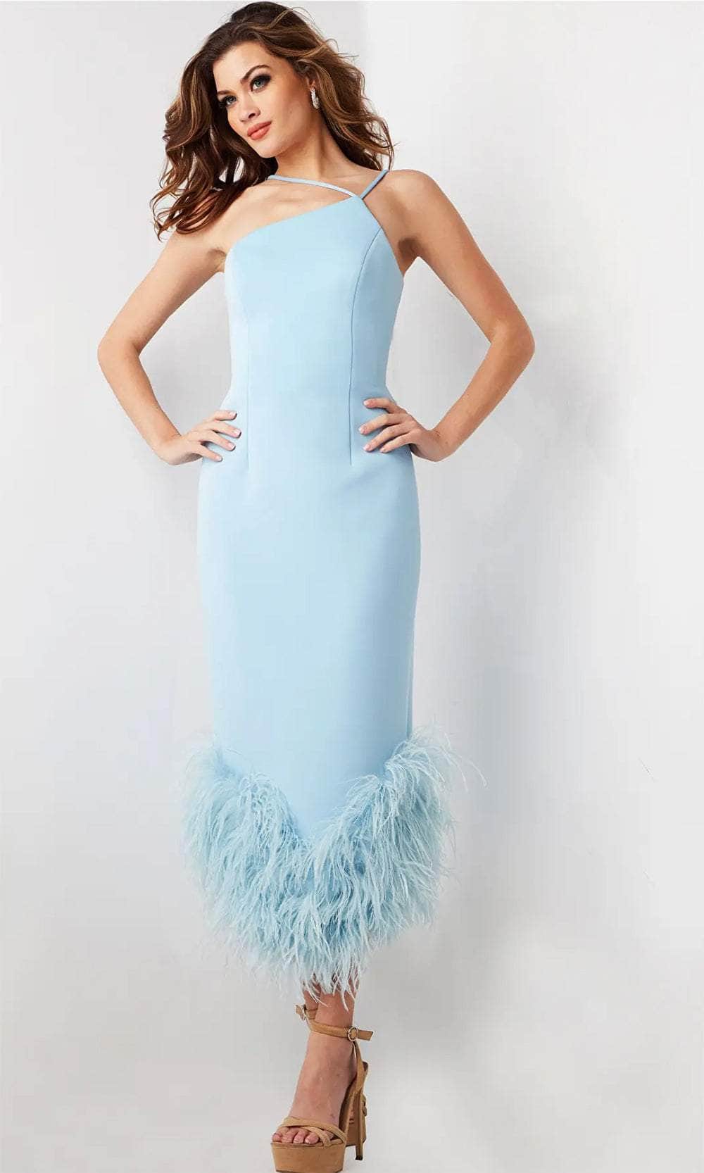 Intensify your classy appeal by wearing this Jovani 36675 creation. This statuesque sleeveless dress is designed to highlight your natural figure. A mesmerizing halter neckline is supported by the spaghetti straps. The straight mid-open detailing at the back adds an element of intrigue and it unveil a glance of your skin. Decorated with soft feathers at the hemline, the skirt prettily carves a sheath silhouette that glides to the tea length. This Jovani creation is a true showstopper for any glamorous affair. Model is wearing Light-Blue color.