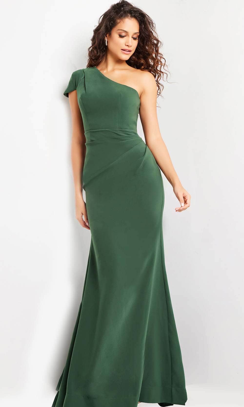 Flatter those exceptional assets as you flourish charm in this Jovani 36699 creation. Designed with tailoring lines that accents the rich silhouette, this gown parades a cap sleeve and an asymmetrical neckline paired with a partial open back and a concealed zipper closure. Accentuated with draping, the figure flattering skirt sculpts into a mesmerizing mermaid design, culminating in a sweeping denouement. Indulge in the enchanting embrace of the Jovani 36699 masterpiece. Model is wearing the Emerald color.