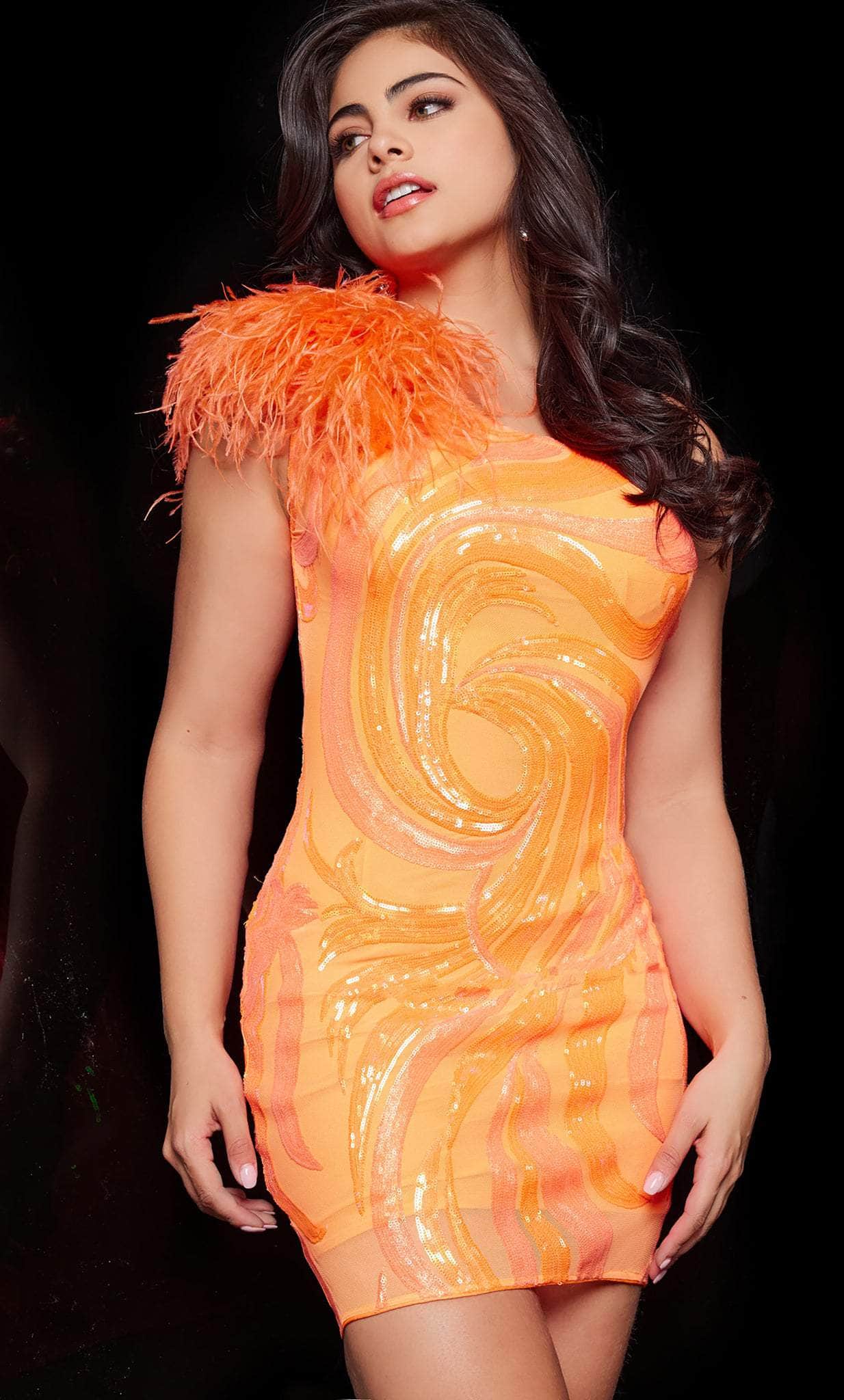 Astound everyone all night long with the iridescence bestowed by this exceptional Jovani 36713 creation. Showcasing multi-toned sequins forming a swirling spectacle, this stunner features an asymmetrical neckline with a shoulder topped with feather fringes. Detailed with a partial open back and a zipper closure, the embellished skirt sculpts the waist and hips before ending into a mini hemline. Charm everyone with the timeless beauty of this Jovani 36713 masterpiece. Models are pictured wearing Green, Orange, Royal, and Lilac colors.