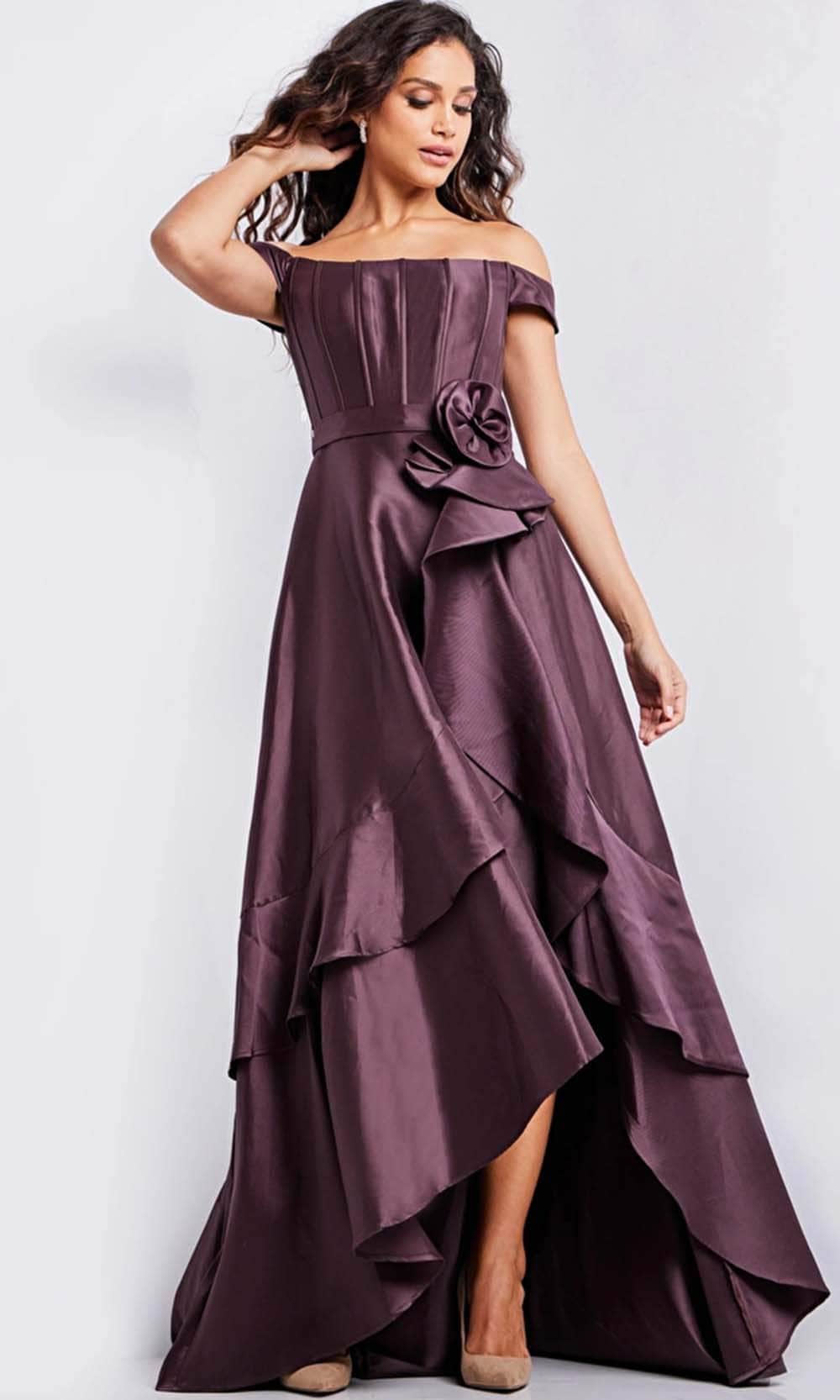 Embody exquisite luxury and style in this sleek stroke of genius by Jovani 37014 creation. Styled with tailoring lines on a sleek, luxurious silhouette, this alluring piece features an off shoulder neckline atop a corset boned bodice. Flaunting a midrise back and a concealed zipper closure, a folded floral accent is highlighted along the waist. The A-line skirt is accented with ruffles as it flows into a high low hem. Fall madly in love with the exceptional elegance bestowed by this Jovani 37014 masterpiece. Model is wearing the Orchid color.