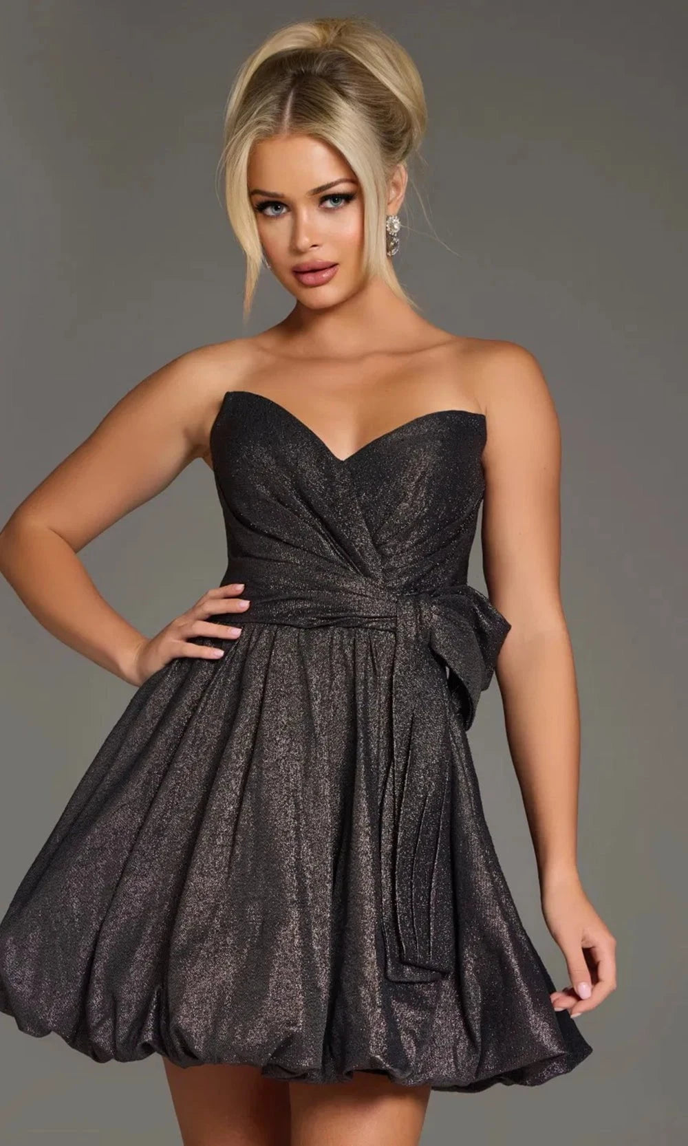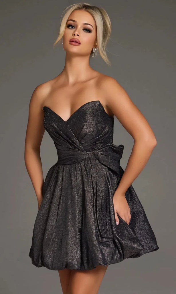 If you are searching for a cocktail dress that brings together flirtation and drama, Jovani 37017 is your go-to piece. This strapless mini dress stuns with its shimmering fabric and eye-catching bubble hem that adds fullness and bounce. The sweetheart neckline offers a romantic touch, while the bow detail at the waist enhances the silhouette for a flattering shape. Perfect for upscale parties or festive nights out, Jovani 37017 design delivers texture, shine, and charm in every step. Model is wearing Black/ Copper color.
