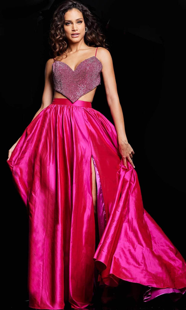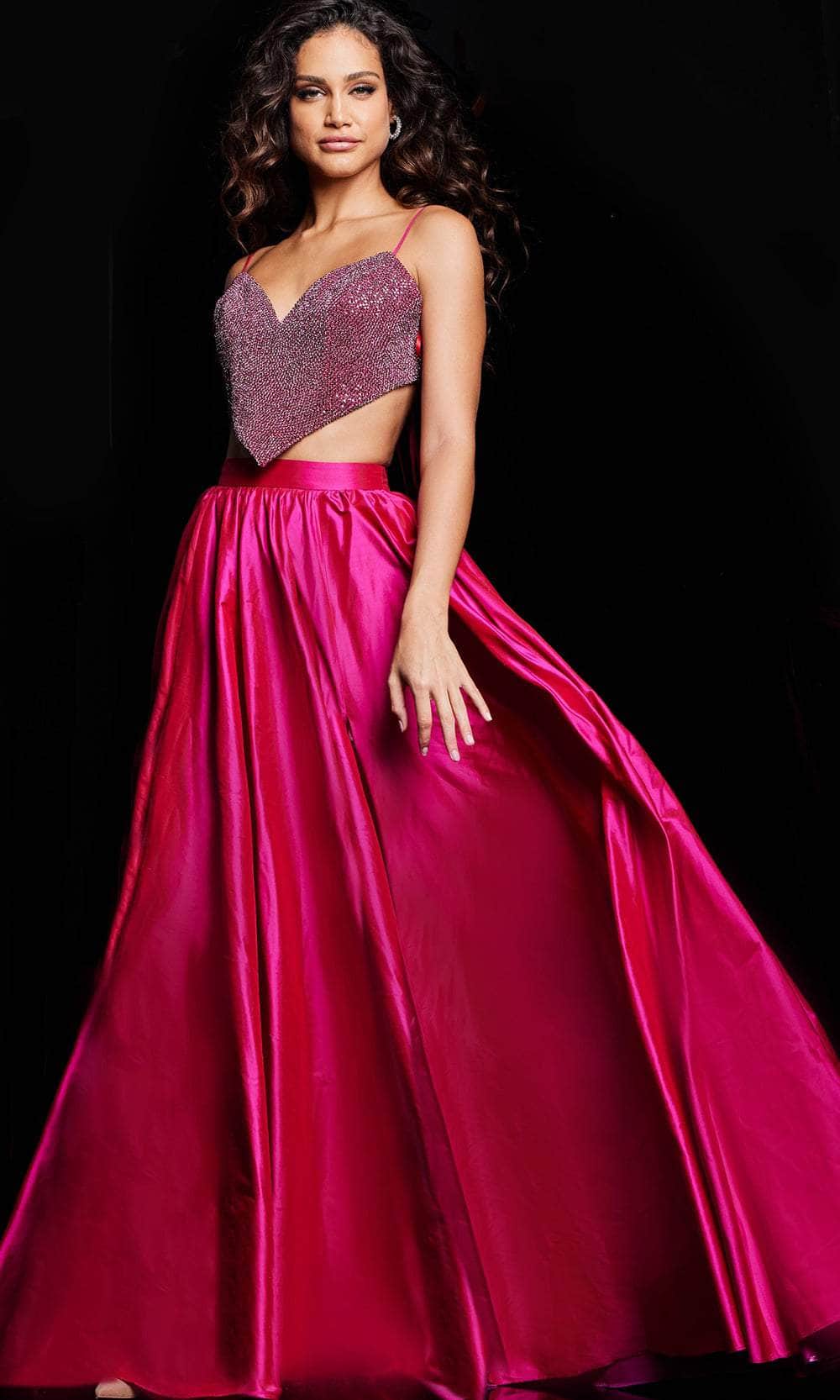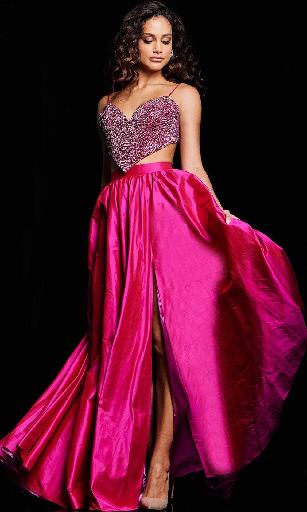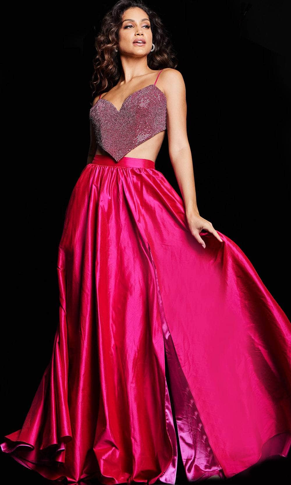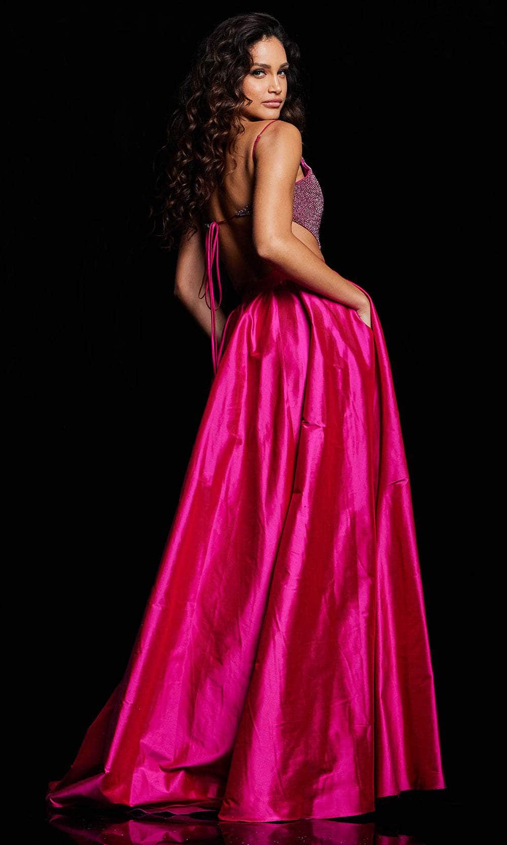 Enchant everyone as you glow with beauty and flair in this mesmerizing Jovani 37045 creation. Exceptionally embellished with rhinestones and a tailored design radiating from the structured bodice, this opulent piece reveals a stunning sweetheart neckline and a an open back with a tie strap detail. Sultrily accented with midriff cutouts that flatter the figure, the ensemble trails down the sleek skirt with a provocative slit. This enchanting beauty cascades into a sweeping train for an utterly charming effect. Convey grace and glamour when you show up in this Jovani 37045 masterpiece. Model is wearing the Fuchsia color.