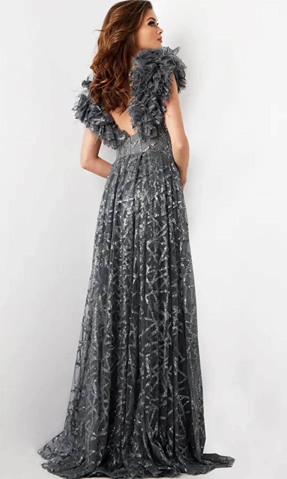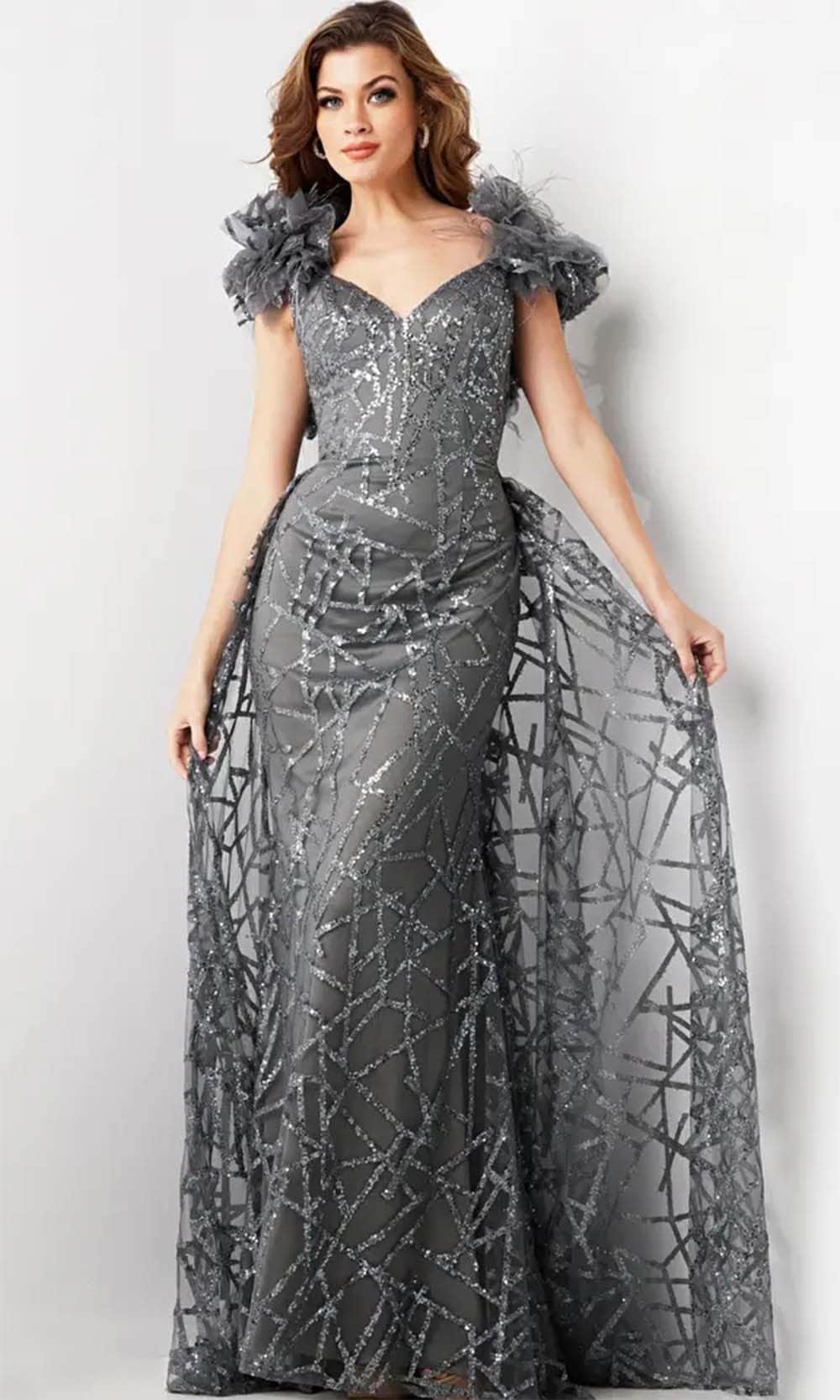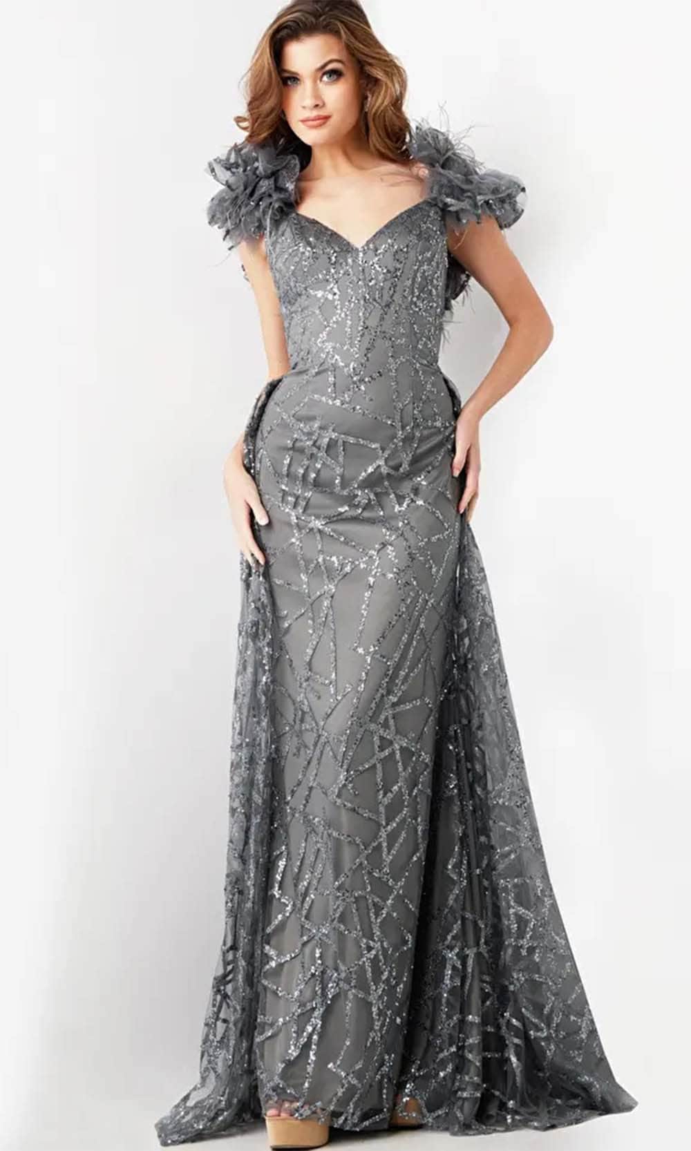 Step into the spotlight with Jovani 37206, a dazzling gown adorned with sparkling sequins for an irresistible allure. The fitted bodice showcases a flattering V-neckline, complemented by charming ruffle cap sleeves. With an open back and center zipper closure, the fit is flawlessly tailored. Below, the floor-length skirt cascades in a sheath silhouette, while an overskirt adds drama, culminating in a graceful train. Radiate elegance and sophistication in this captivating Jovani 37206 on any special occasion. Model is wearing Gunmetal color.