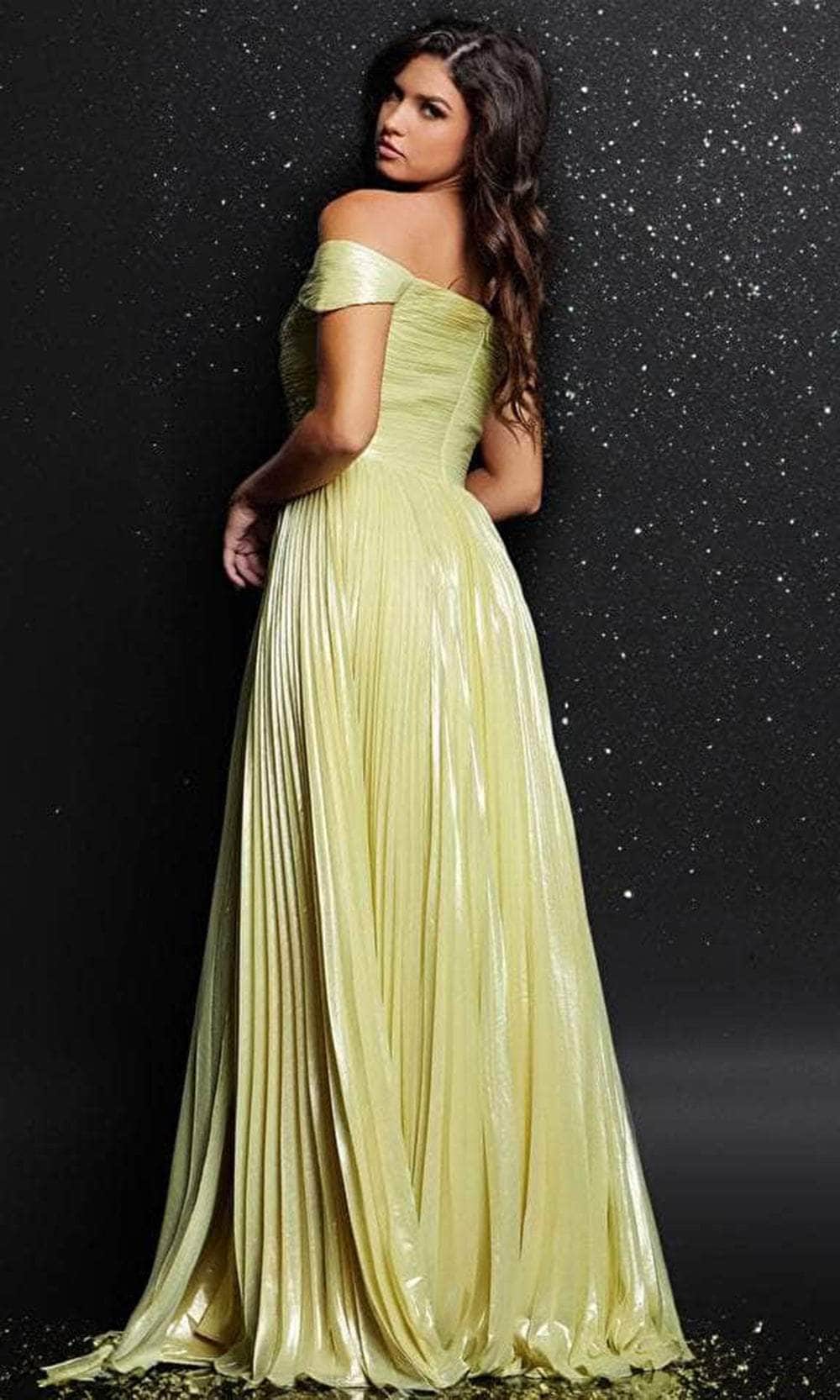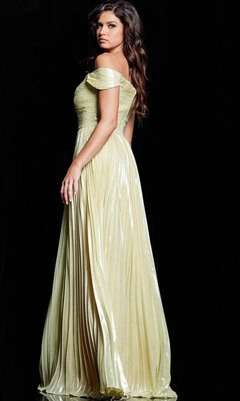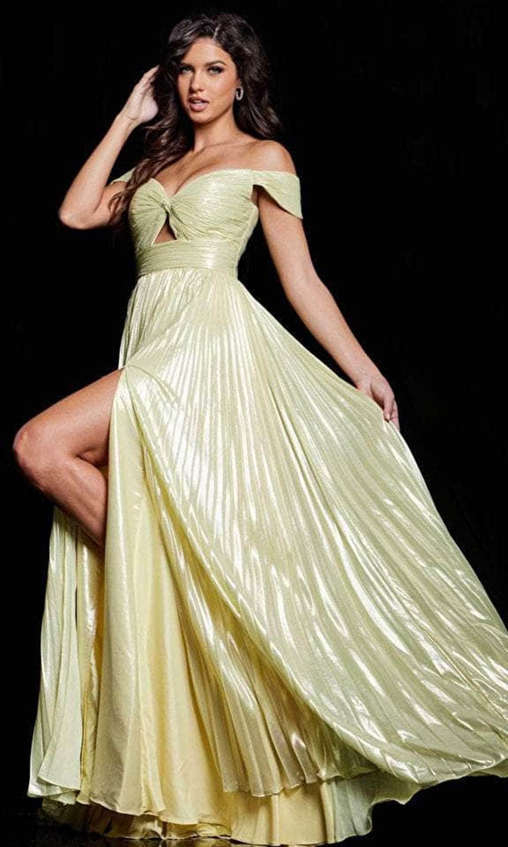 Get ready to own the night in this Jovani 37389 creation. Enhance your feminine charm in this fit and flare gown fully designed with pleated. The off-shoulder sweetheart neckline frames your collarbones in a flattering way, complemented by cap sleeves. In addition, the wide waistband, cutout at the bust, and mid-open detail are featured. The A-line skirt amazingly drapes to the floor and ends with a thigh-high leg slit. This Jovani 37389 gown is suitable for any evening event. Model is wearing the Yellow color.