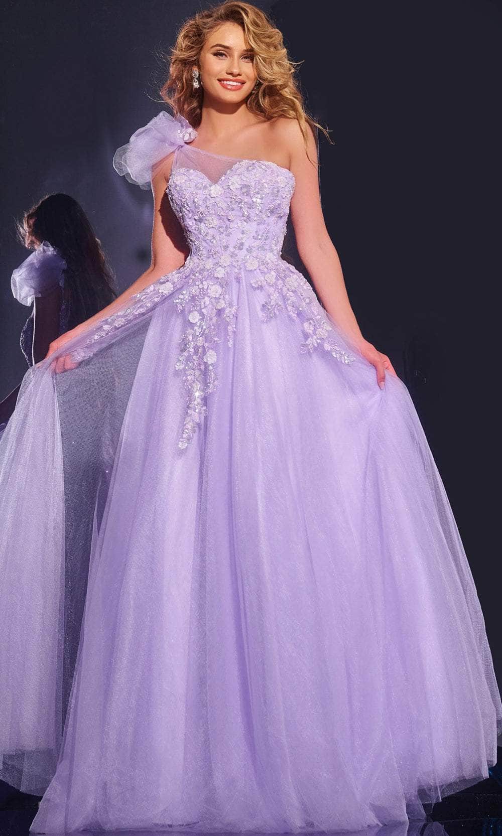 Step into enchanting style with Jovani 37427, a breath taking ballgown that exudes romance and elegance. This floor-length gown features an asymmetrical neckline with a sheer one-shoulder strap, beautifully complemented by a sweetheart lining that adds a touch of charm. Delicate floral appliques adorn the bodice, flowing gracefully into a voluminous pleated skirt. Perfect for any grand occasion, this gown combines timeless beauty with a modern twist. Capture unforgettable moments with the exquisite design of Jovani 37427. Model is wearing Lilac color.