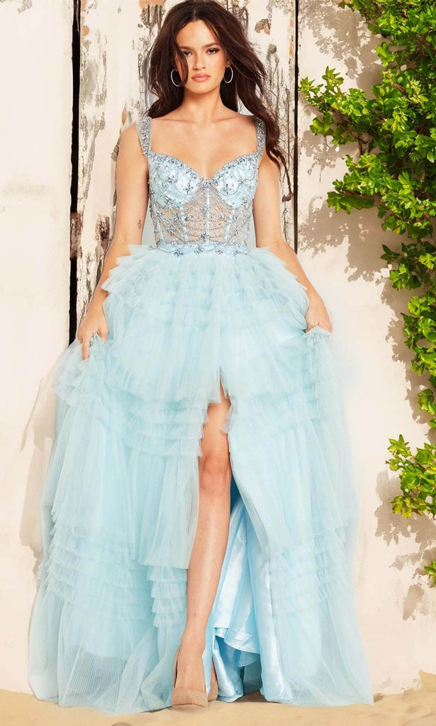 Look like a real-life princess in this Jovani 37438 creation. With a sleeveless design, this style emphasizes the illusion corset bodice with exposed boning and intricate beadwork. It also boasts wide shoulder straps for comfort and support, while the straight mid-open back is closed by a center zipper. The skirt has a whimsical touch of ruffled tiers and forms a voluminous ballgown silhouette. A thigh-high slit at the side elongate your flirty legs. This trendsetting Jovani 37438 is sure to get you noticed. Model is wearing the Grey/Blue color.