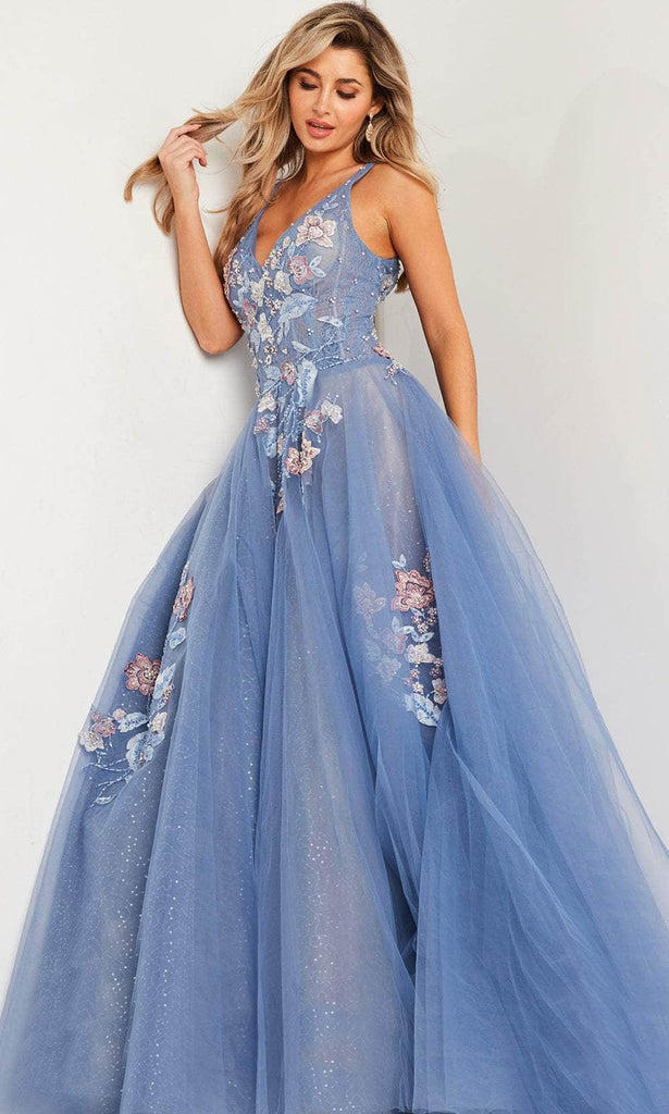 Bloom in magnificent beauty and grace in this Jovani 37468 masterpiece. Designed to enchant the crowd, the sleeveless gown is ornamented with floral embroidery and beadwork. Furthermore, it features a sequin-adorned overlay that adds a glittery charm, as well as a corset lace bodice. The deep v-neckline and v-open back with zipper closure are all featured. The full length forms a truly stunning ballgown silhouette that pools into a sweeping train. This Jovani 37468 gown has impeccable magic in every detail. Model is wearing the Blue color.