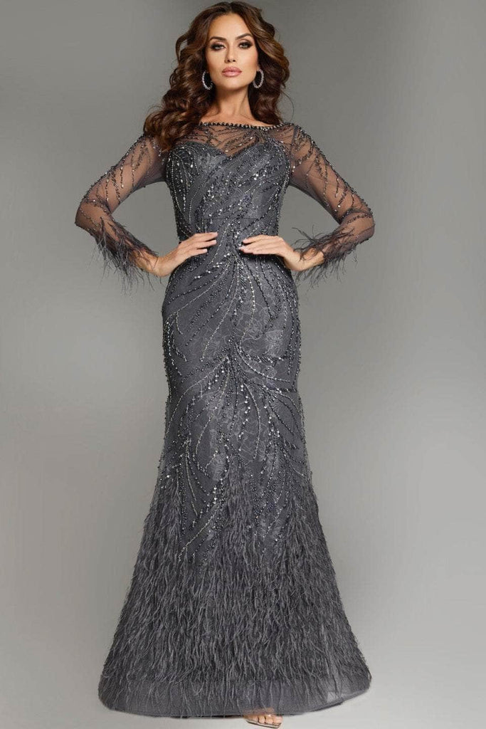 Radiate pure elegance Jovani 37560, an epitome of elegance and sophistication. This exquisite gown features a fitted silhouette that elegantly flares into a stunning floor-length finish. The dress boasts a sophisticated bateau neckline and sheer long sleeves, intricately adorned with beading and embroidery. Feathered details enhance the cuffs and hemline, adding a touch of elegance and drama. The back of the gown is styled with a deep V-cut, ensuring you make a striking entrance and exit. Perfect for any formal occasion, this Jovani 37560 promises to leave a lasting impression with its impeccable design and luxurious details. Model is wearing Charcoal color.