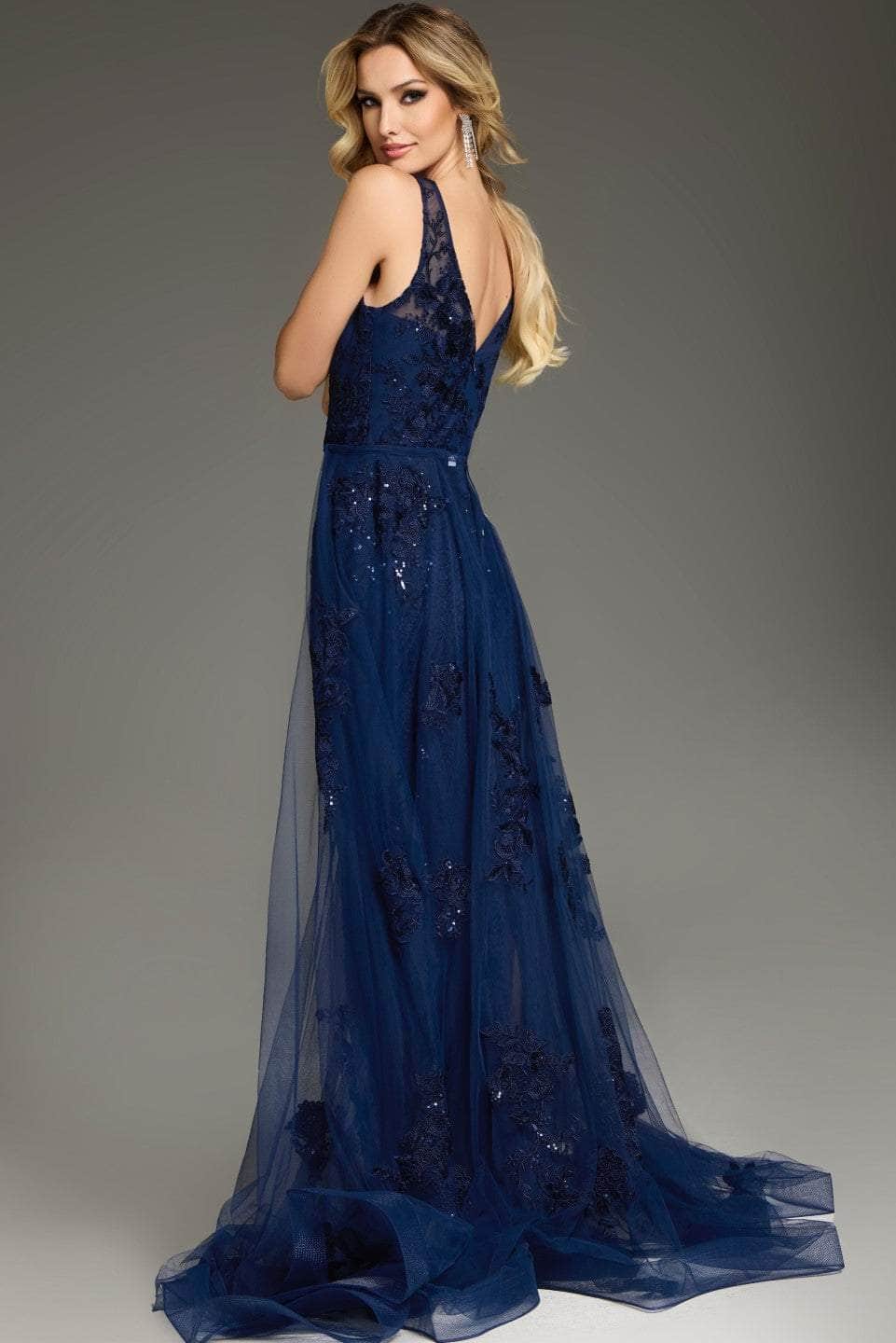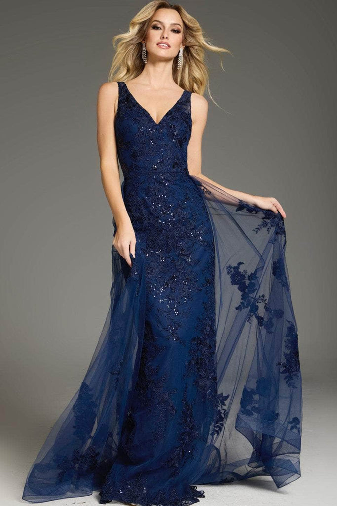 Transform into a vision of elegance with the Jovani 37600 evening gown. This captivating sleeveless dress features a floor-length silhouette, flowing gracefully with intricate floral sequin embroidery. The deep V-neckline that perfectly matches the V-shaped Back adds a sophisticated touch, while the sheer overlay cascades gently, creating an ethereal effect. Ideal for formal occasions, this Jovani 37600 blends classic charm with modern allure, ensuring you stand out with timeless style. Model is wearing Navy color.