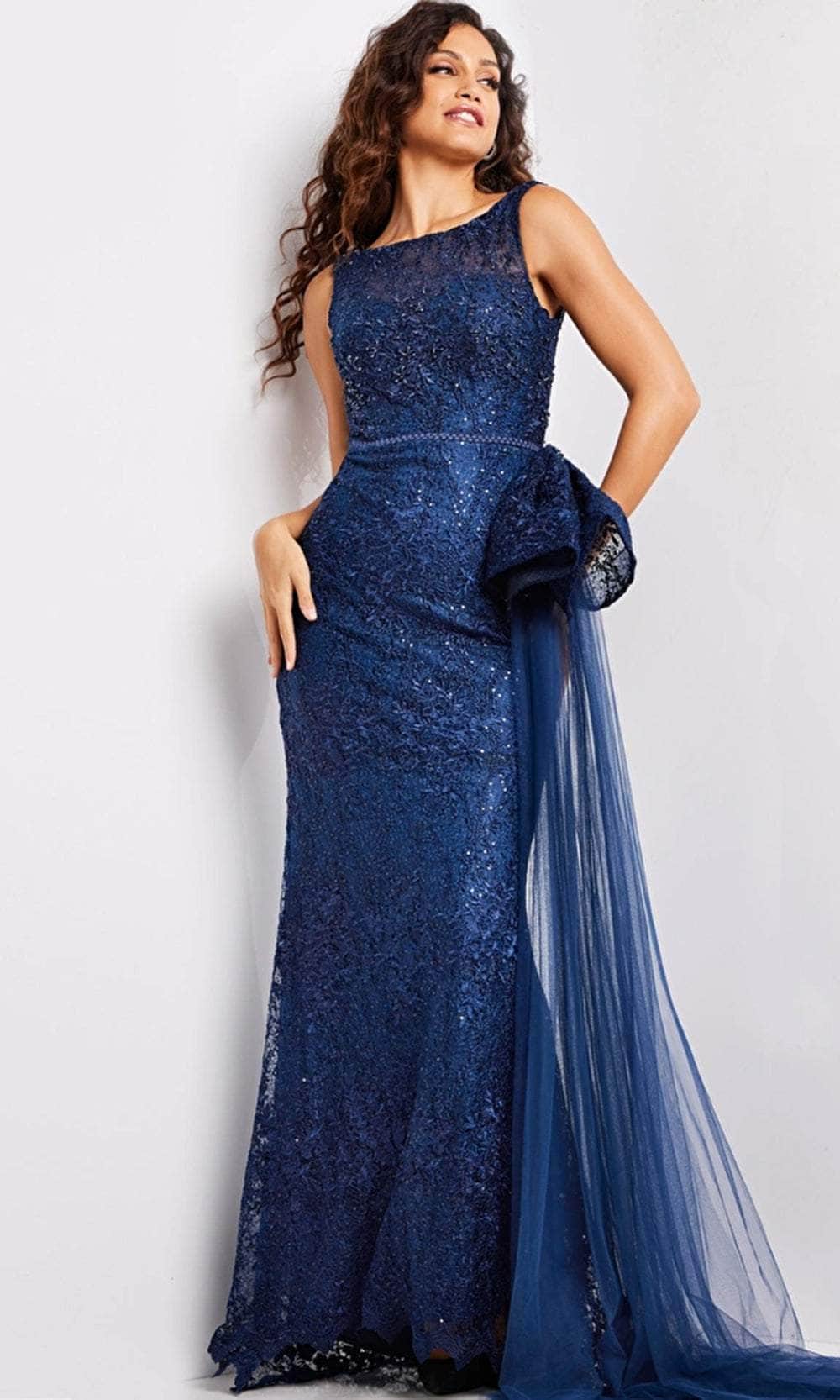 Step into timeless elegance with Jovani 37602, an exquisitely sophisticated dress that exudes effortless glamour. This sleeveless ensemble boasts a banded waist adorned with intricate floral embroidery and a pleated cape, adding a touch of grace to the silhouette. Also, the ensemble is further complemented by a sweeping train, elevating its allure and creating a breathtaking statement. Perfect for any formal occasion, Jovani 37602 is your ideal choice for an event brimming with sophistication and grace! Model is wearing Navy color.