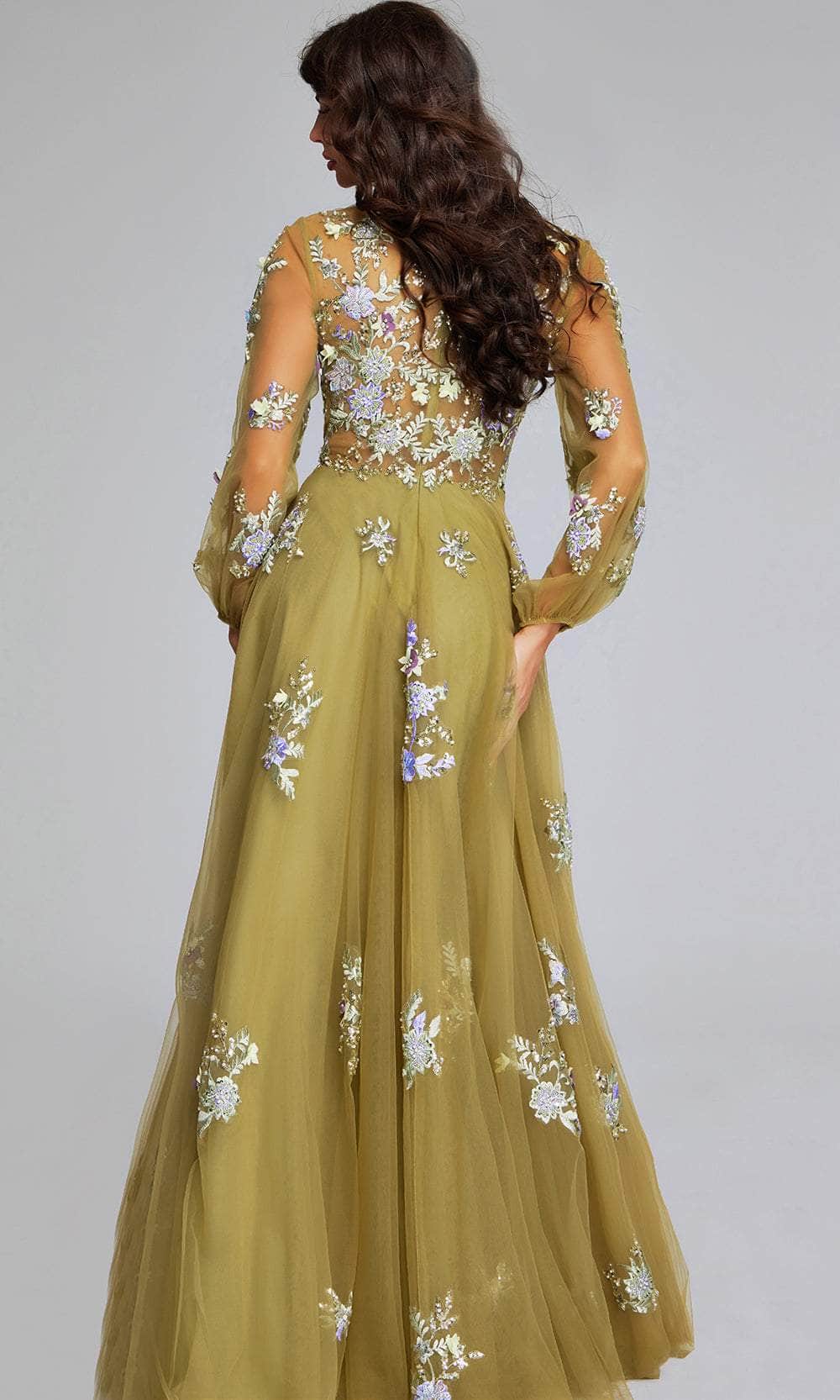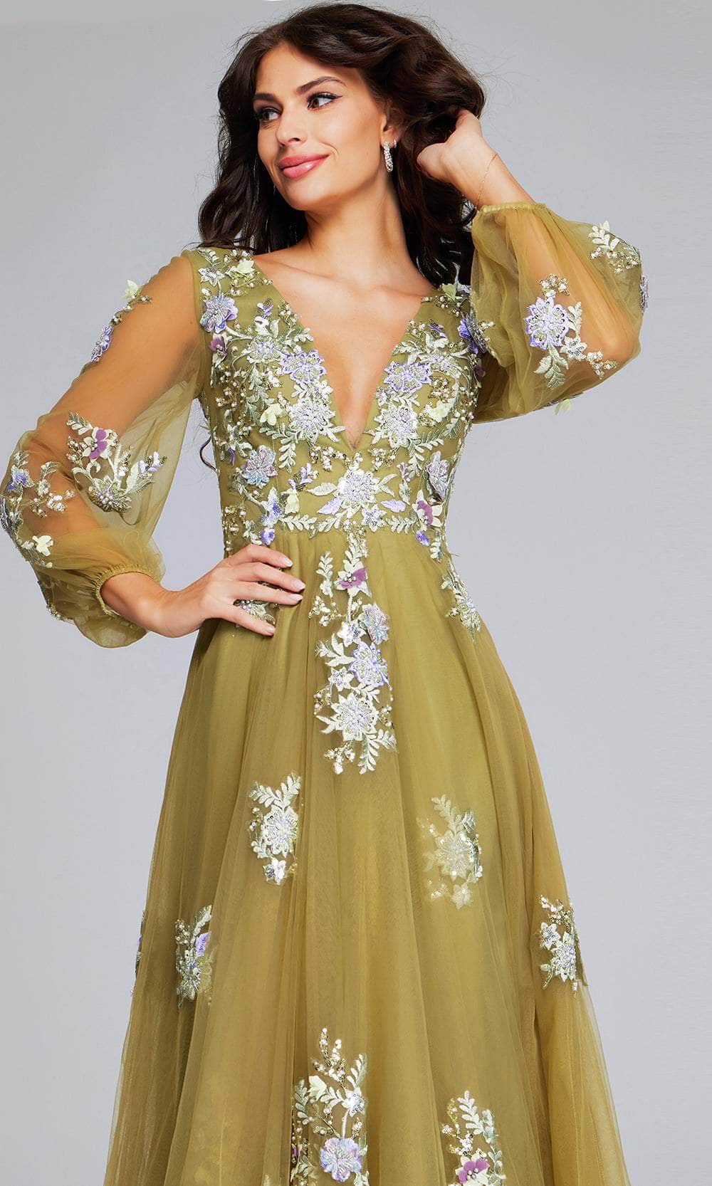 Get ready to charm hearts in the Jovani 37607 style. This gown is a true work of art with its floral embroidery and sparkly bead adornment. The deep v-neckline and illusion back add a touch of allure, accompanied by the sheer long bishop sleeves for perfect arm coverage. The hidden zipper closure in the back ensures a great fit and keeps this ensemble together. The A-line skirt flows effortlessly to the floor and beautifully flatters every figure. Perfect for any special event, this Jovani 37607 long gown is an absolute show-stopper! Model is wearing Green color.
