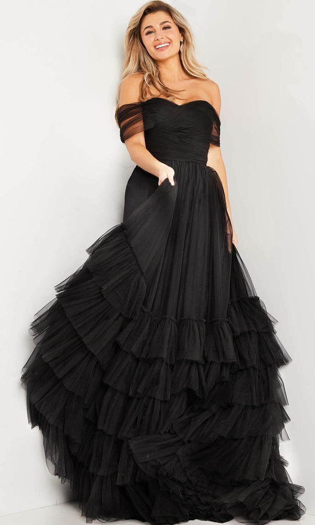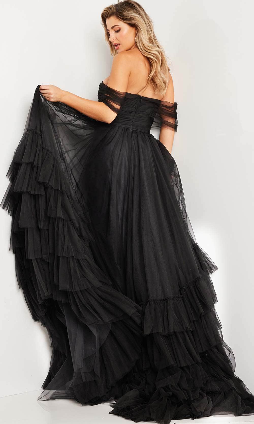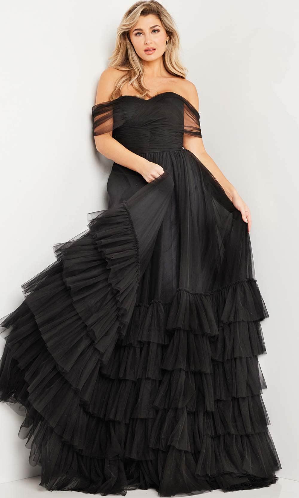 Admire the immaculate artistry of this stunningly crafted Jovani 37608 creation! Adorned with intricate shirring which artfully weaves as it defines the tailored silhouette, this piece showcases an off the shoulder neckline accompanied by sheer sleeves. Showcasing a mid-open back and a concealed zipper closure, this ethereal skirt flourishes a ravishing A-line silhouette, finished with a ruffled rendering and a trailing train. Make an impact when you glide into the ballroom in this Jovani 37608 masterpiece. Model is wearing the Black color.