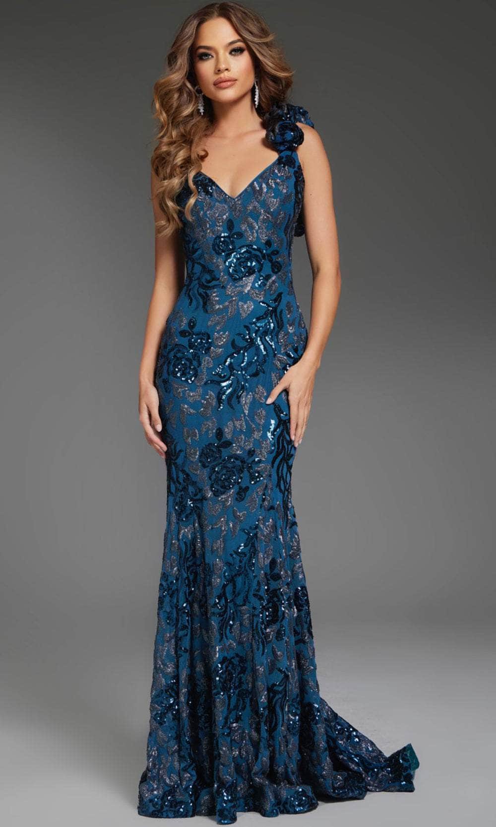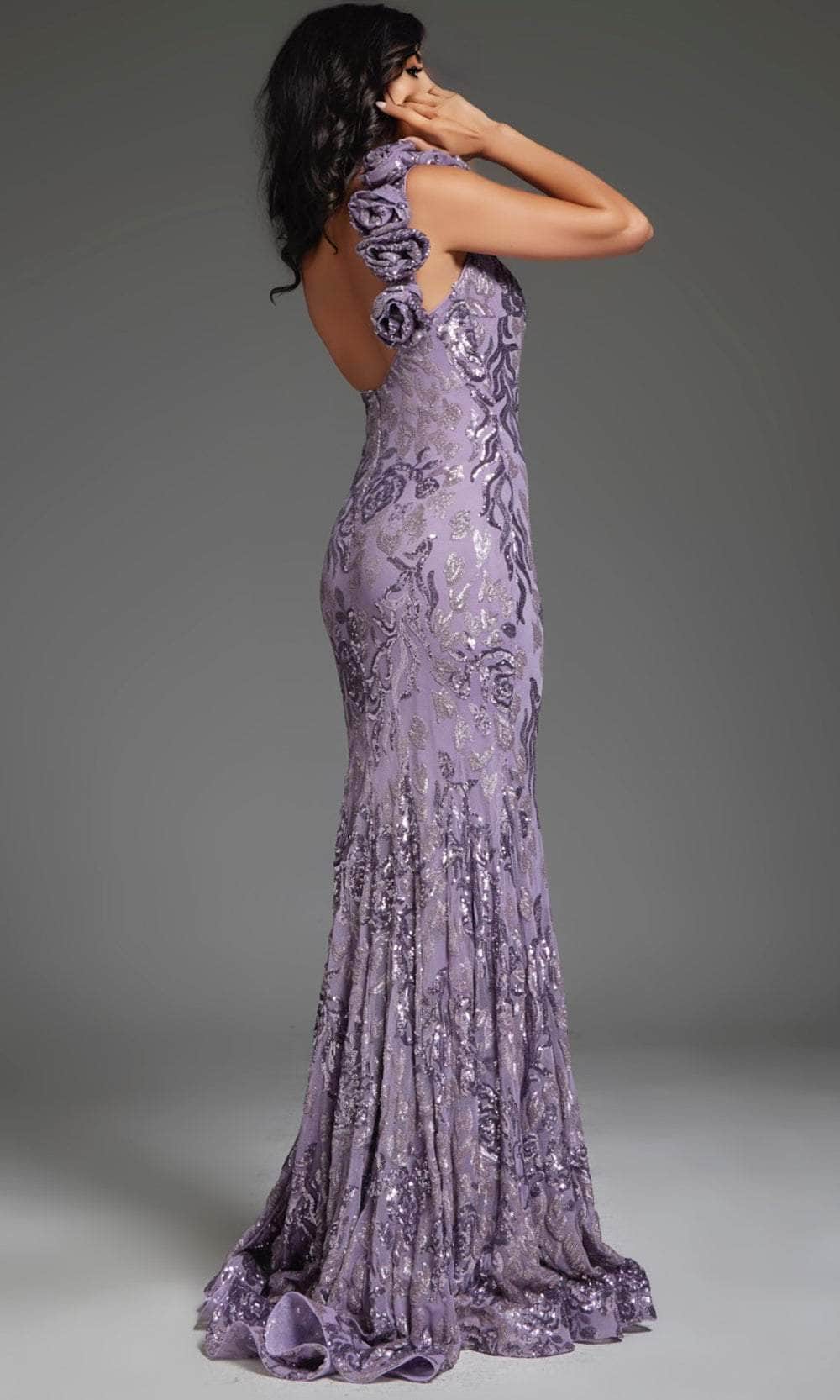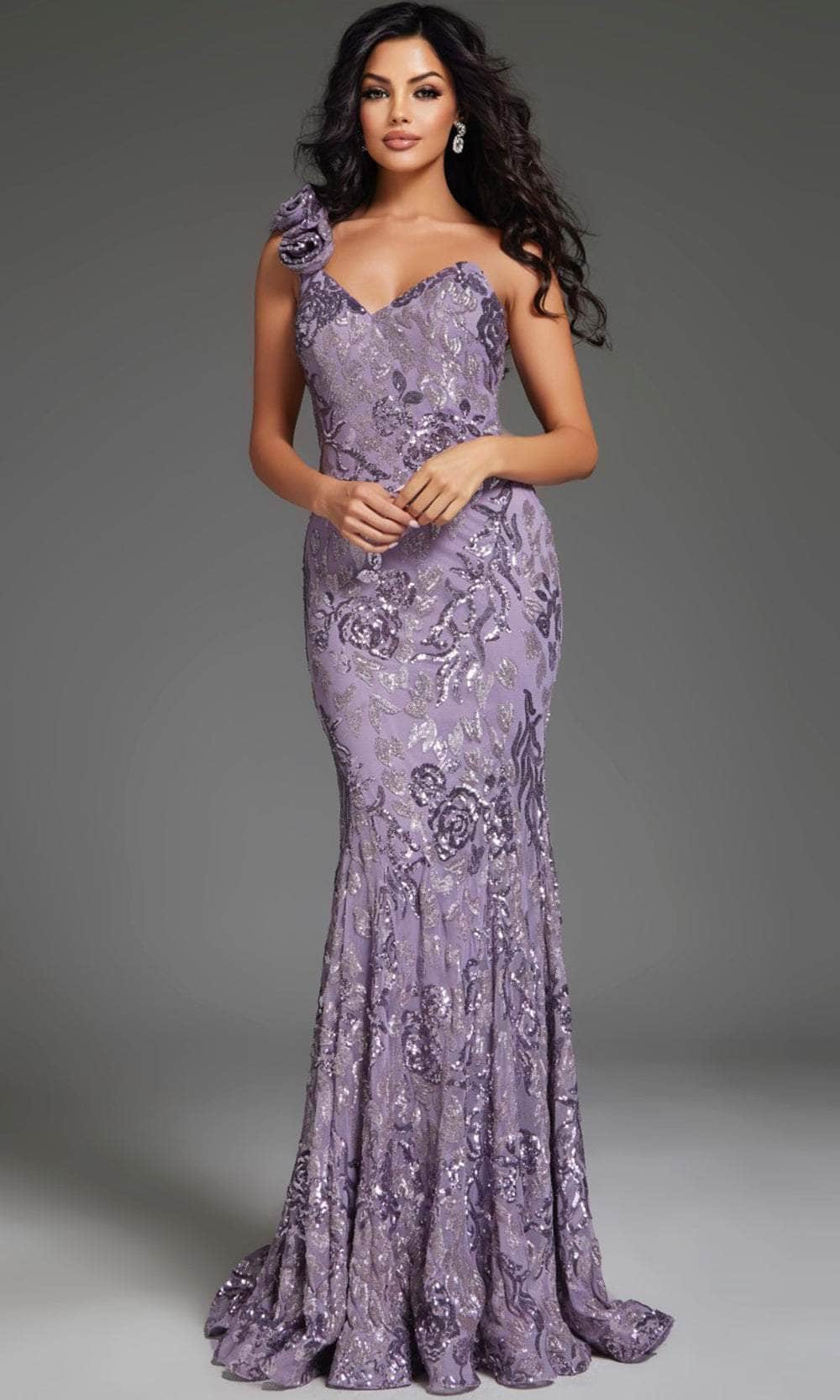 Unveil timeless beauty with the Jovani 37634 gown. This exquisite floor-length dress features intricate floral embellishments that add a touch of whimsy and elegance. The fitted silhouette gently flares at the hem, creating a graceful flow with every step. The one-shoulder design is highlighted by a striking ruffle detail, adding sophistication and a modern twist. A sweetheart neckline beautifully complements the form-fitting bodice, enhancing your natural curves. The open back design adds a hint of allure, making this Jovani 37634 perfect for any formal occasion where you want to leave a lasting impression. Models are wearing Lavender and Slate colors.