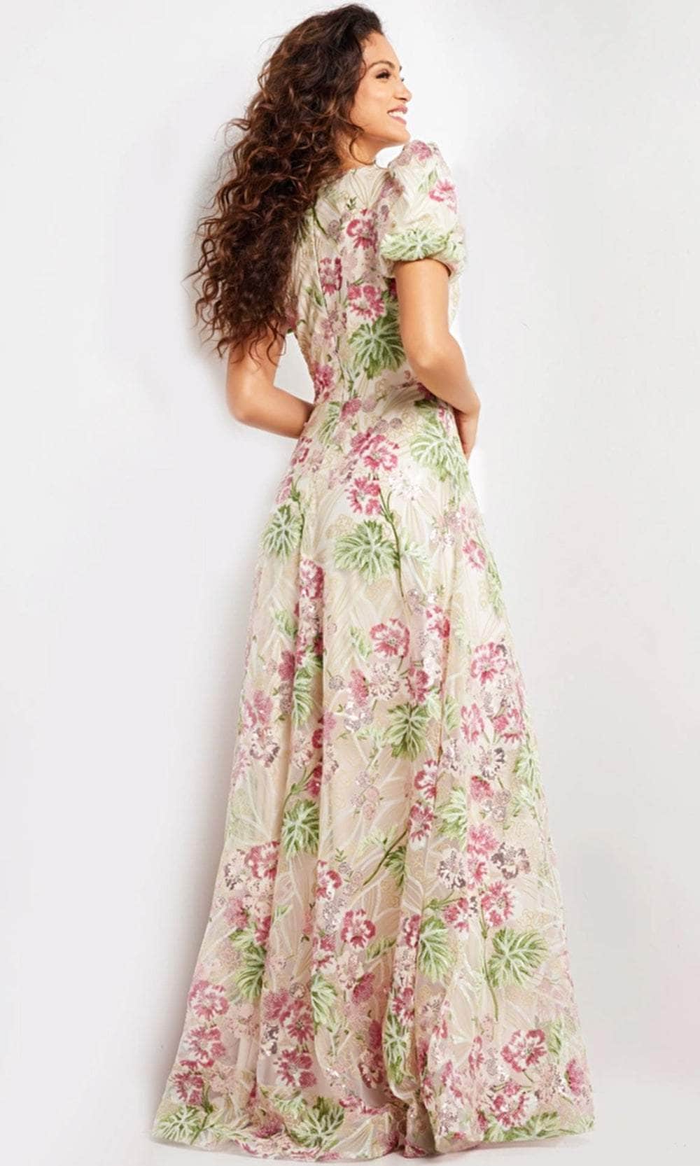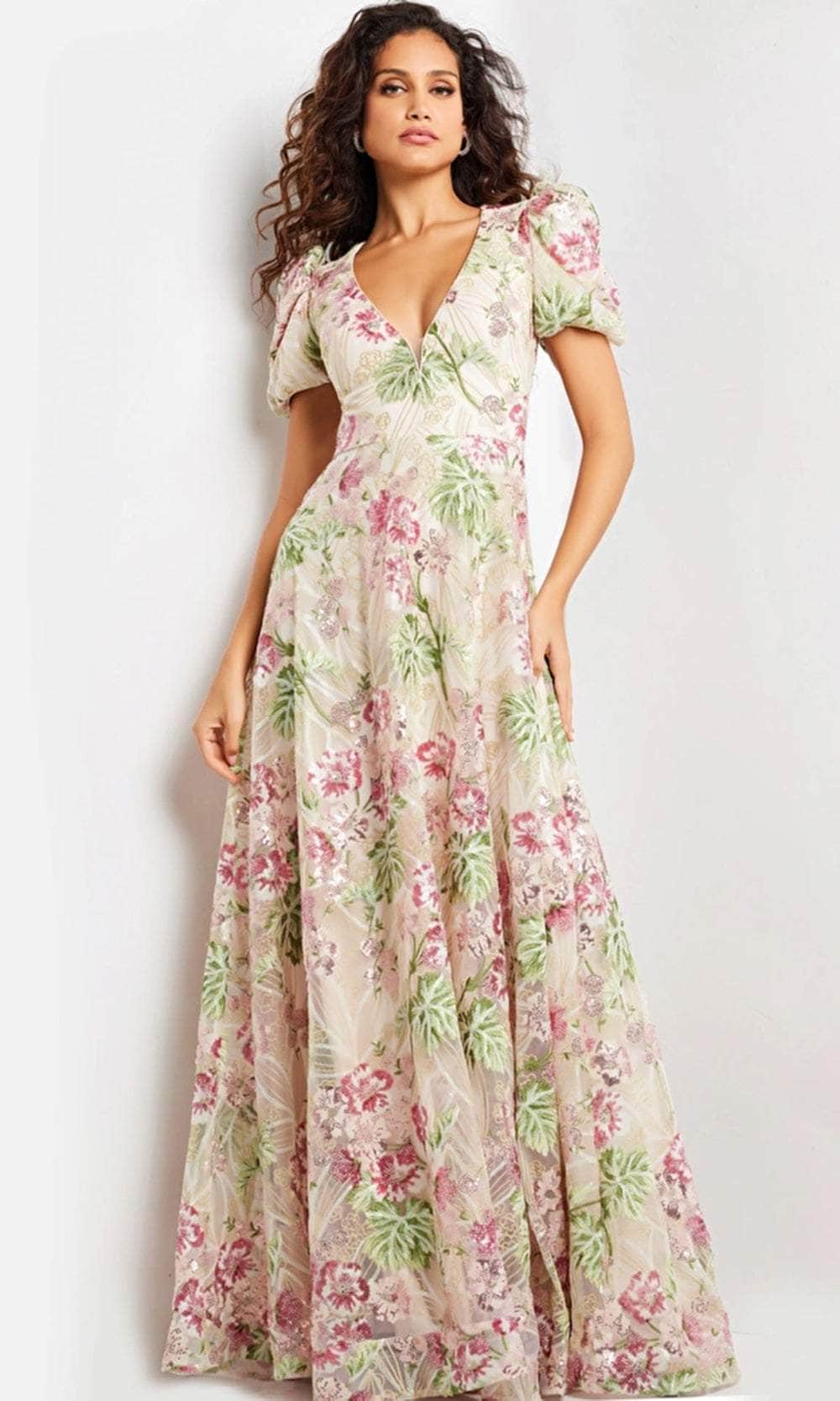 Be the embodiment of elegance and sophistication in Jovani 37636, an enchanting masterpiece that commands attention. This classically designed dress boasts sheer puff-short sleeves, delicately framing your arms and adding an ethereal allure to the ensemble. With flattering natural silhouette accentuates the captivating floral print, creating a symphony of beauty and grace. A deep V-neckline exudes sophistication, while the convenient zipper closure at the back ensures ease of wear, and is finished by a light train. Jovani 37636 promises a timeless blend of elegance and uniqueness! Model is wearing Multi color.