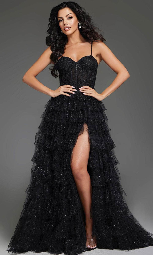 Clothe yourself in creative couture with this eye-catching Jovani 38278 gown. This style showcases a structured corset-boned bodice that shapes and supports, complemented by adjustable spaghetti straps for a personalized fit. The sweetheart neckline is paired with an alluring mid-open zippered back. The tiered ruffle skirt cascades beautifully, creating a playful yet stylish A-line silhouette. Finished off with radiant beadings and a seductive thigh-high leg slit. Make every moment unforgettable by wearing the Jovani 38278 masterpiece. Model is wearing Black color.