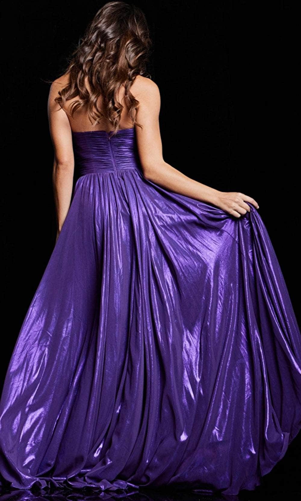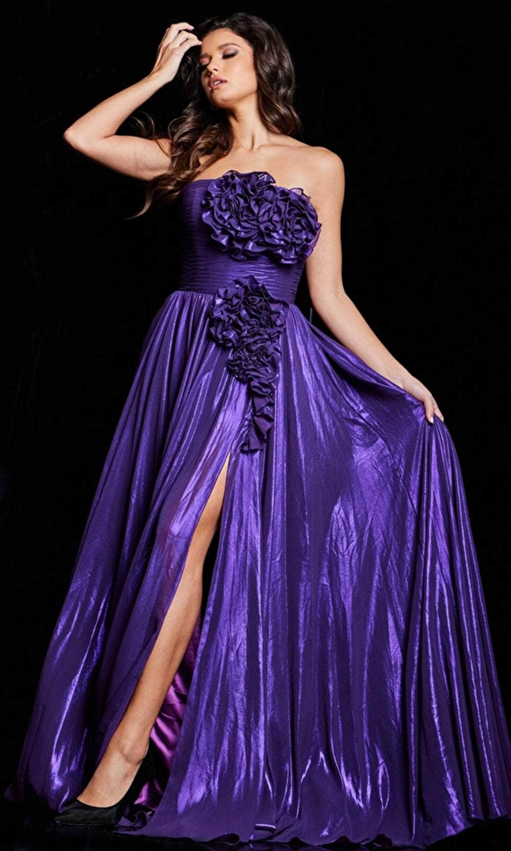 Command the evening with an air of spectral elegance embodied in Jovani 38280. This off-shoulder gown enchants with a pleated bodice and a ruched skirt adorned by a lavish, sizable applique. A high thigh slit adds a final touch of poise, while the sweeping train completes the classic silhouette. A graceful back zipper accentuates the overall look, allowing for a seamless and graceful finish to this exquisite ensemble in Jovani 38280! Model is wearing Purple color.
