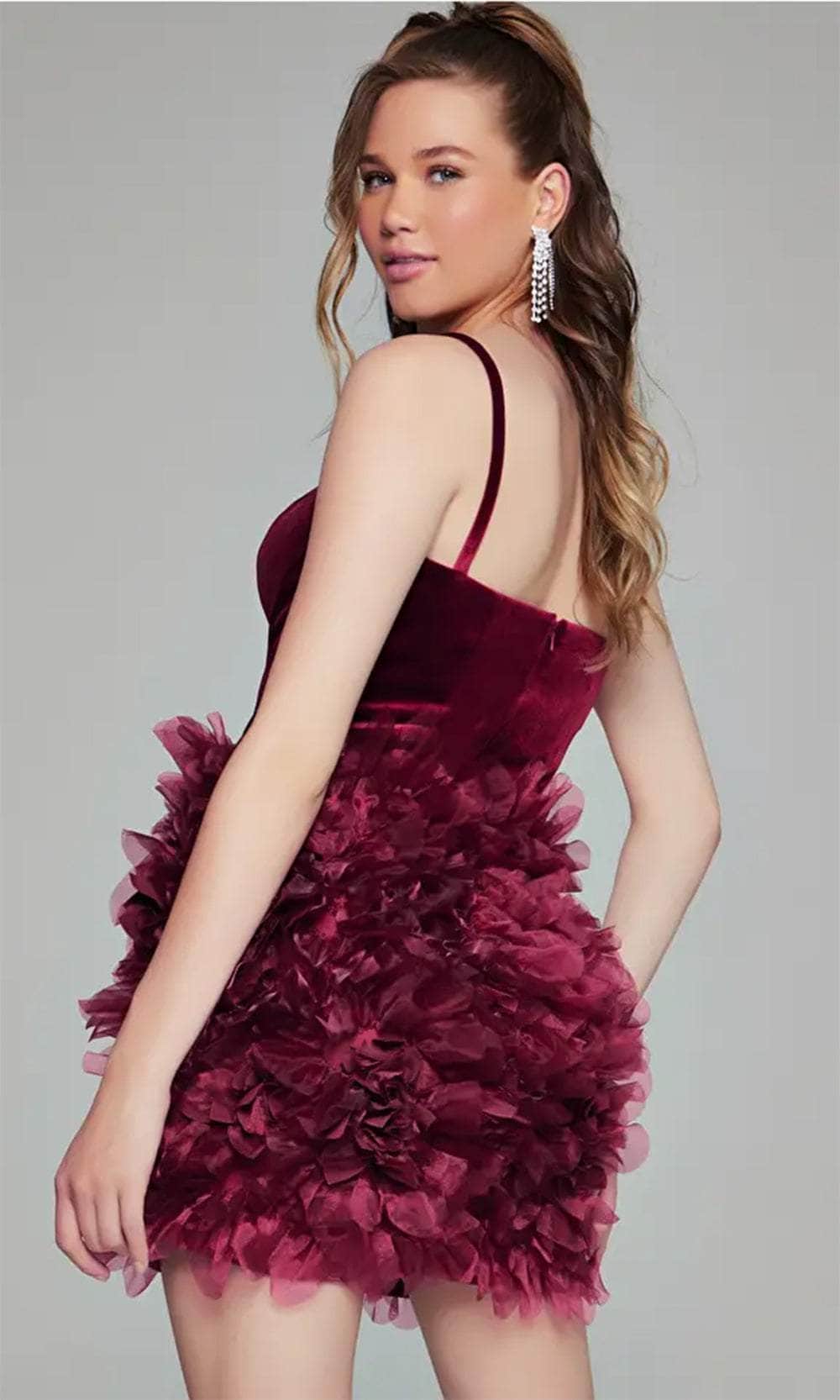 All eyes are on you in this Jovani 38495 masterpiece. This sleeveless design is made from velvet fabric, and flaunts a straight across neckline with delicate spaghetti straps for support. The mid-open cut in the back reveals a hint of your skin, and is secured by the concealed zipper closure. The ruffles on the sheath skirt add a playful and feminine touch, finished off with a short hemline that lets you flaunt your sexy legs. This Jovani 38495 dress is sure to make you feel confident and beautiful. Models are wearing Black, and Burgundy colors.