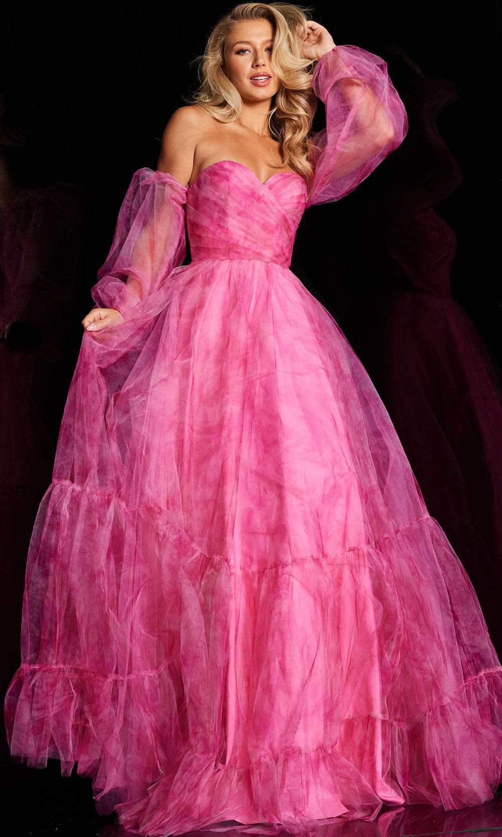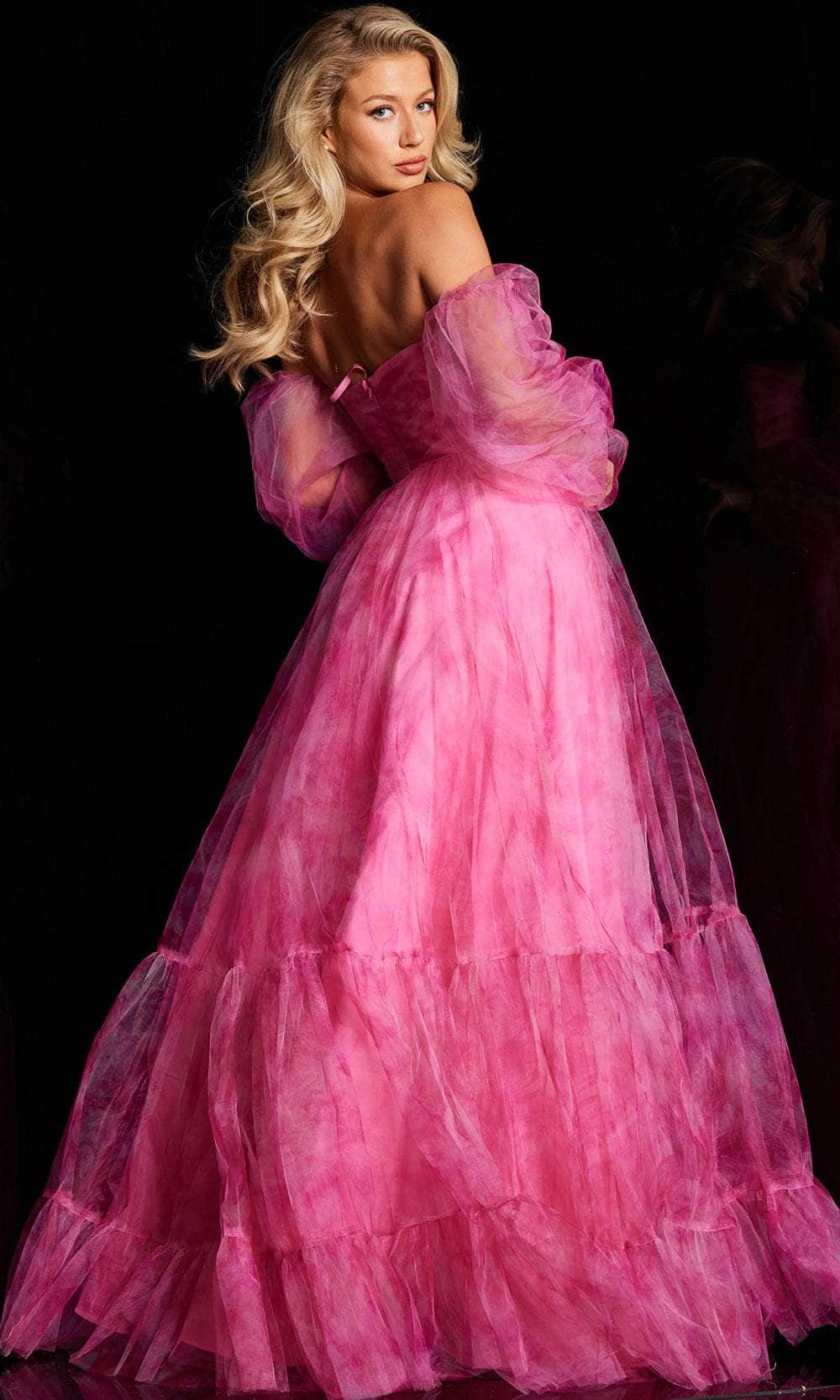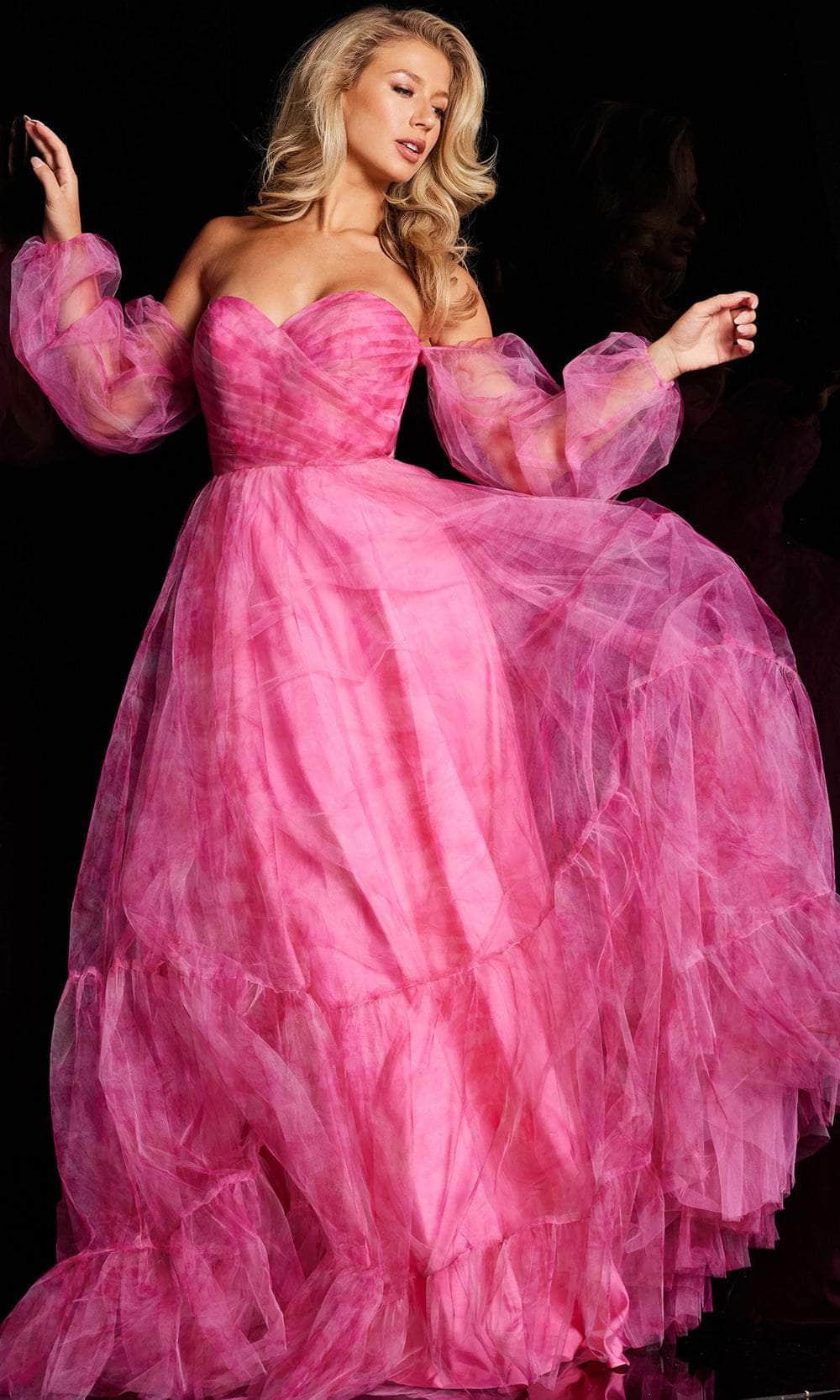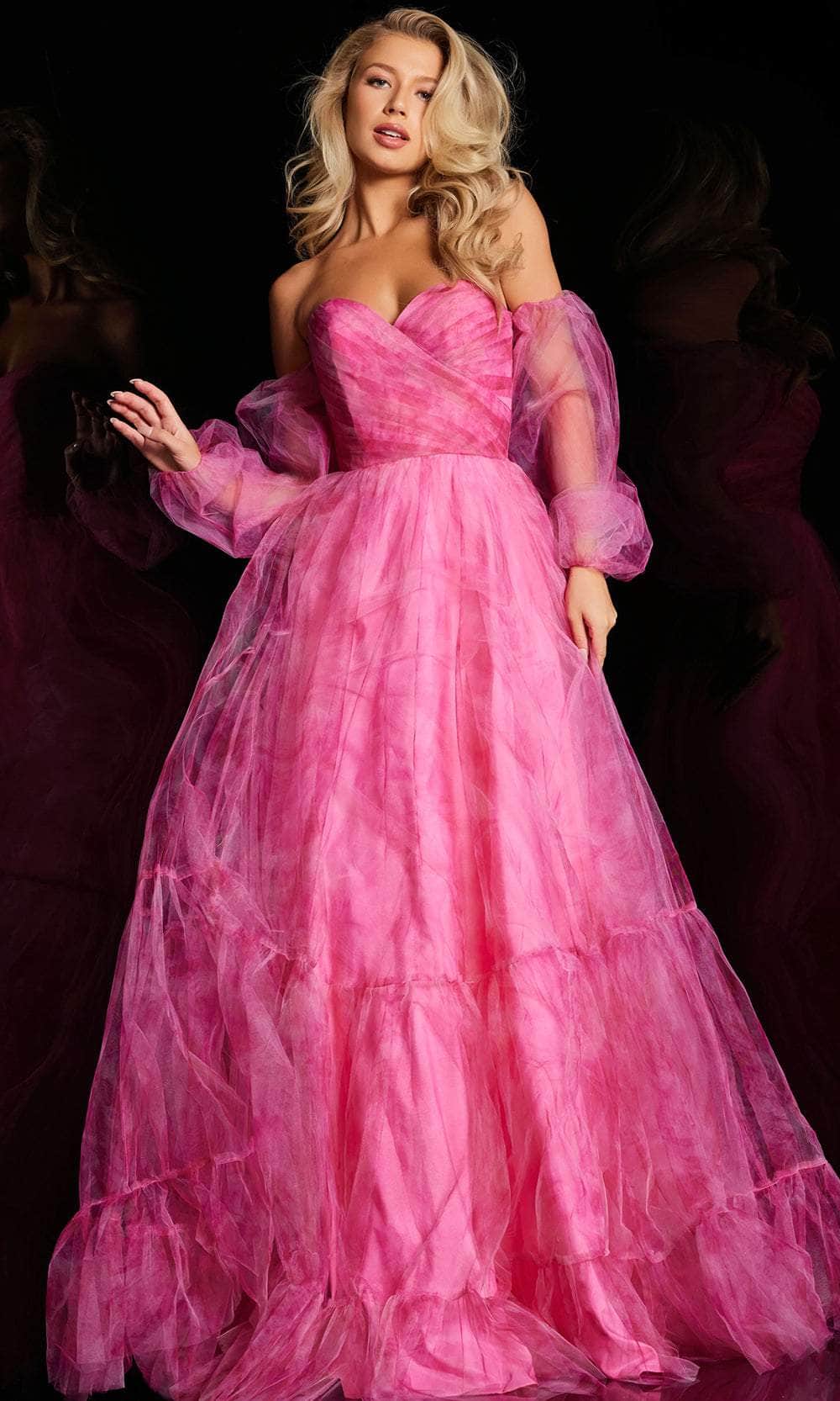 Turn heads in Jovani 38605, a prom dress crafted from exquisite organza printed fabric. The off-shoulder bodice is a vision of elegance, adorned with meticulous pleated detailing and crowned with a sweetheart neckline. Bishop sleeves add a touch of romantic flair, while the floor-length skirt flows gracefully in a flattering A-line silhouette. This enchanting Jovani 38605 ensemble is the epitome of sophistication, making it the perfect choice to showcase your style and grace on any special occasion. Model is wearing Fuchsia color.