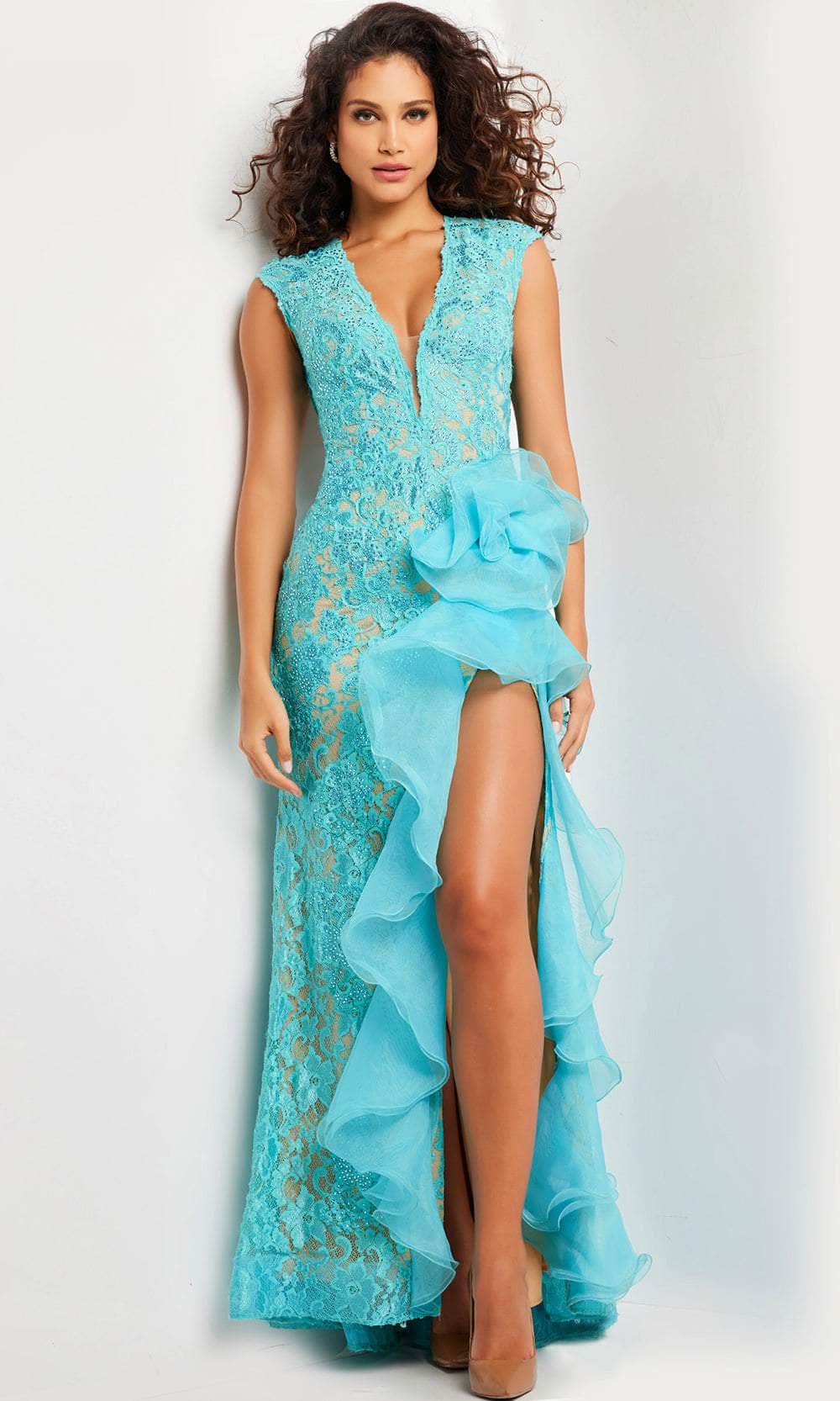 Drape yourself in elegance with Jovani 38668, a beautifully crafted dress in intricate lace fabric. The cap sleeves add a touch of sophistication, while the plunging V-neckline, adorned with a sheer insert, creates a captivating focal point. A back cut-out, secured with a center zipper closure, adds a modern twist, and a rosette detail at the waistline enhances the charm. The floor-length sheath skirt is adorned with a slit featuring delicate ruffle details, completing this Jovani 38668 ensemble with grace and style. Models are wearing Coral and Turquoise colors.