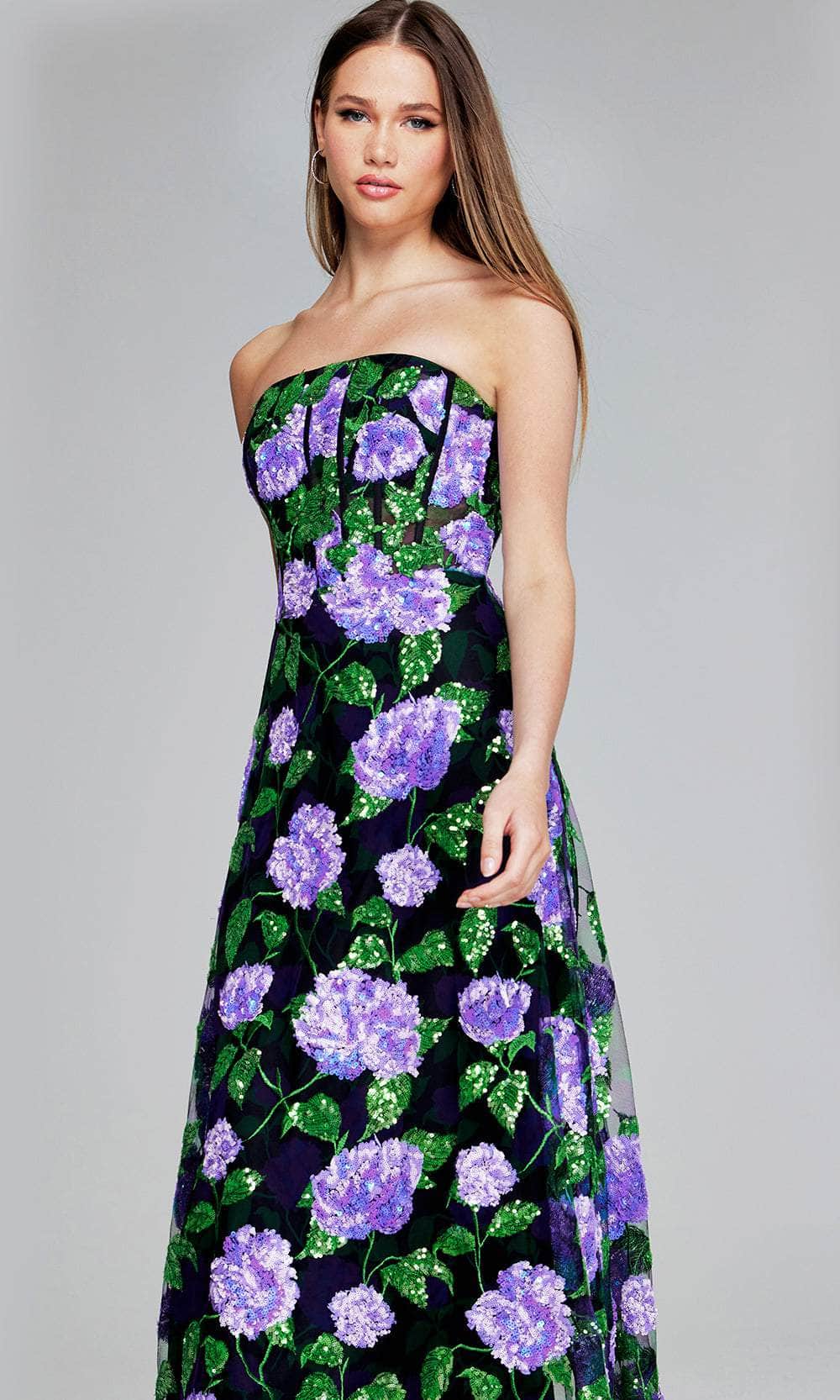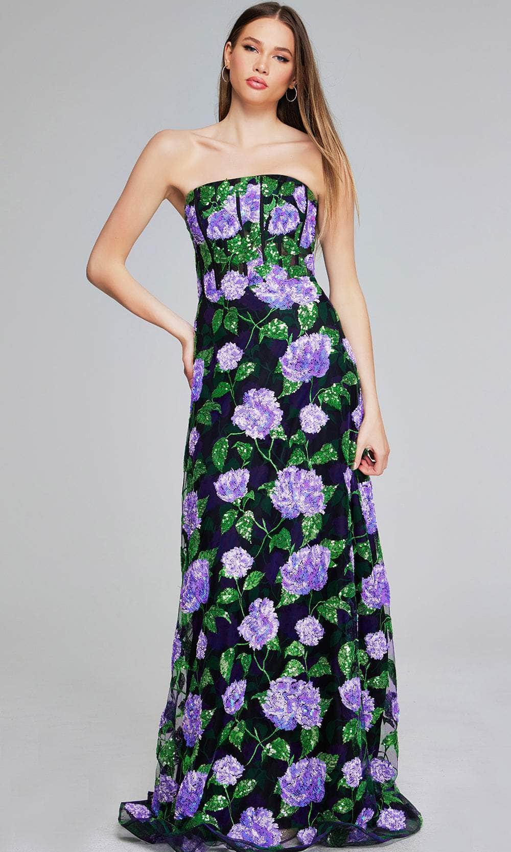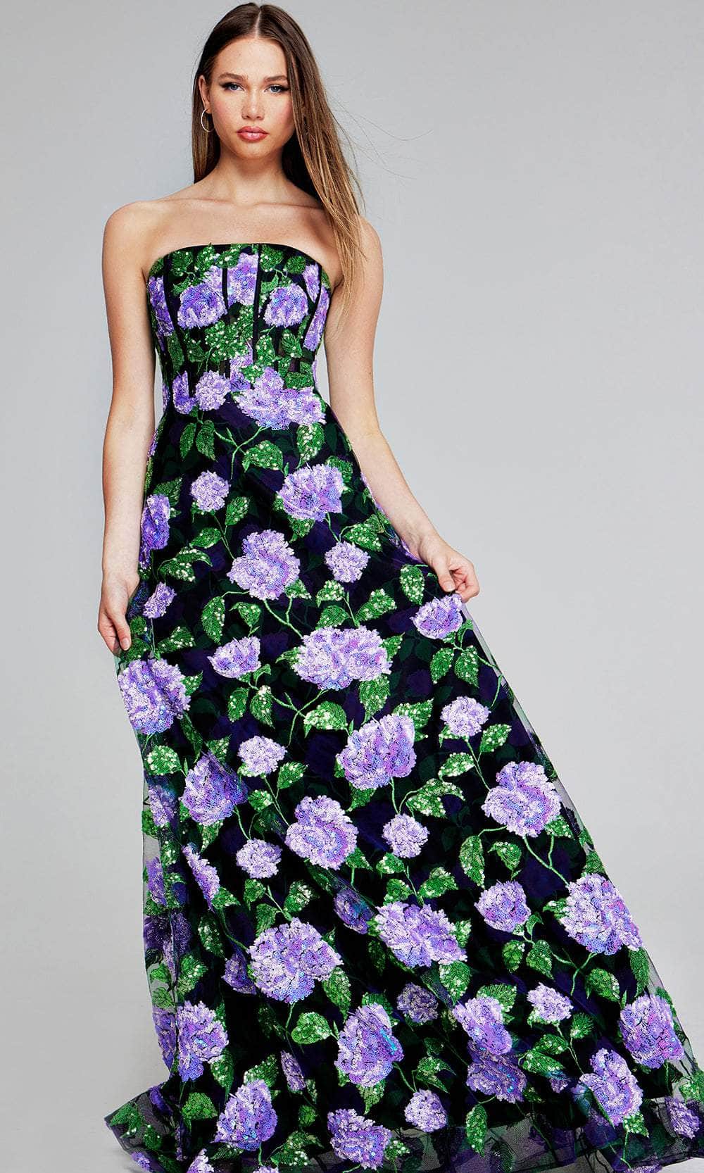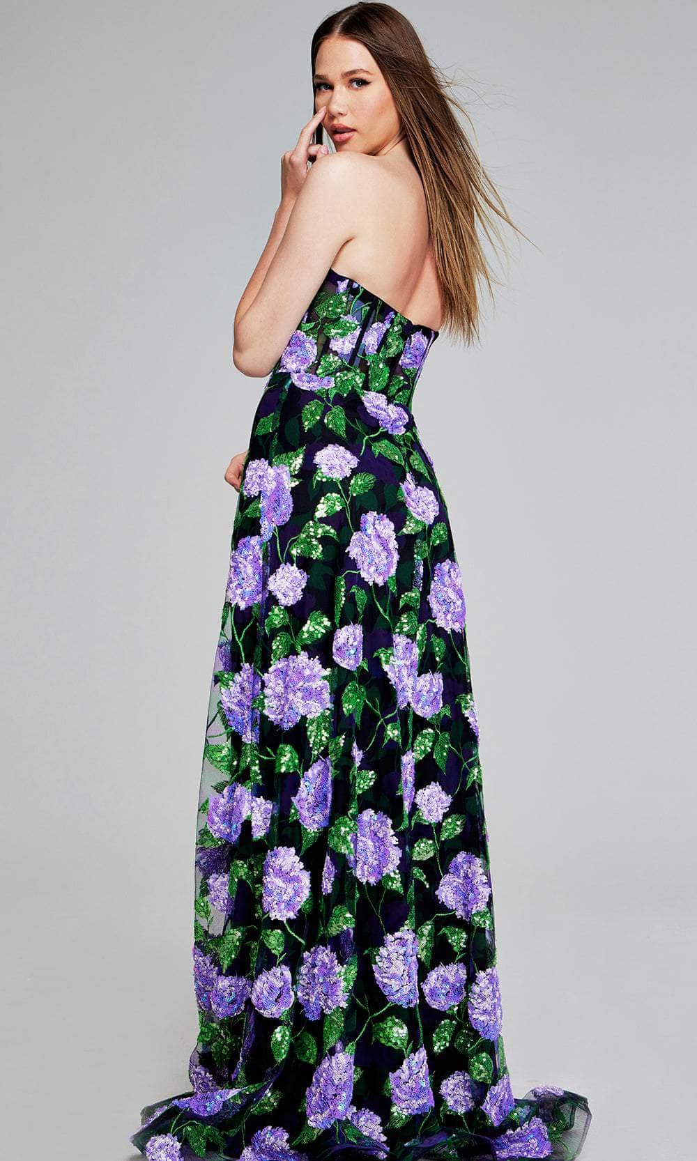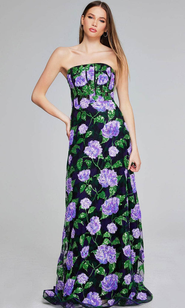 Experience the beauty and stylishness of this Jovani 39116 masterpiece. Attention-grabbing from top to hem, the gown is embellished with a vibrant floral pattern of sequins and embroidery. Displays are strapless style topped by the appealing straight-across neckline and mid-open back. The illusion corset bodice with an exposed boning creates a flawless and flattering fit. Falling the floor and sweeping train with poise, the skirt makes an A-line silhouette that flatters every body type. Shine like the star that you are in this Jovani 39116 creation. Model is wearing Purple/Multi color.