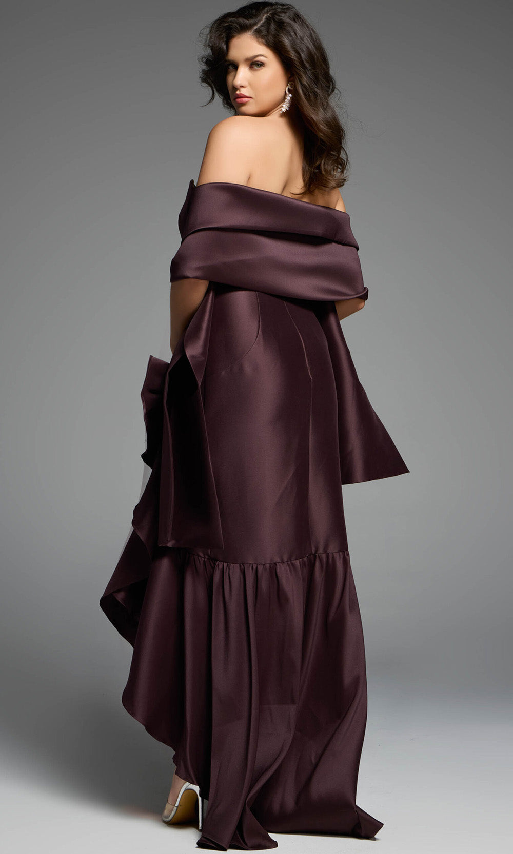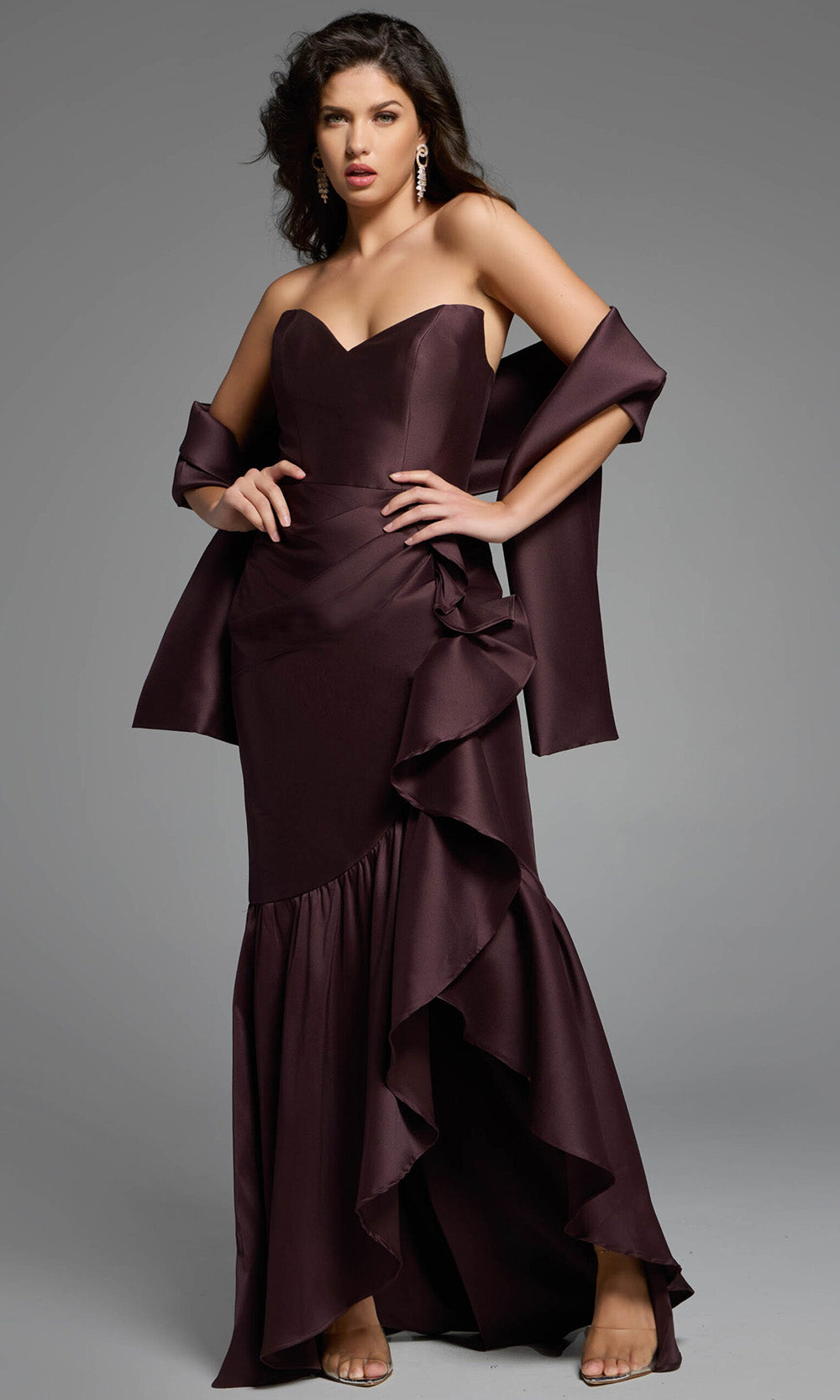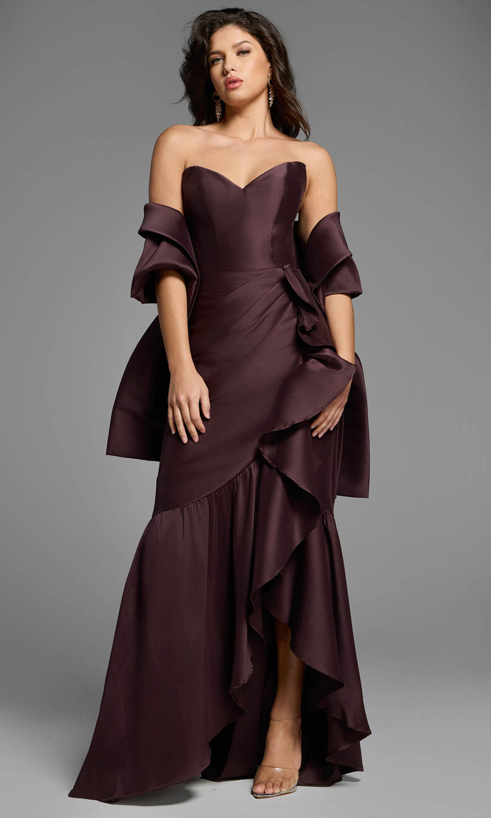 Refined yet dramatic, the Jovani 39265 is a strapless gown that makes a long-lasting impression. Its sweetheart neckline frames the decolletage beautifully, while an asymmetrical ruffle trim adds sculptural dimension down the sheath skirt. The high-low hemline offers a contemporary twist, showcasing footwear while maintaining a formal presence. The smooth satin fabric drapes elegantly over the figure, creating a polished and luxurious feel. Perfect for upscale gatherings, the Jovani 39265 blends timeless elements with modern design for an unforgettable look. Models are wearing Brown, and Indigo colors.