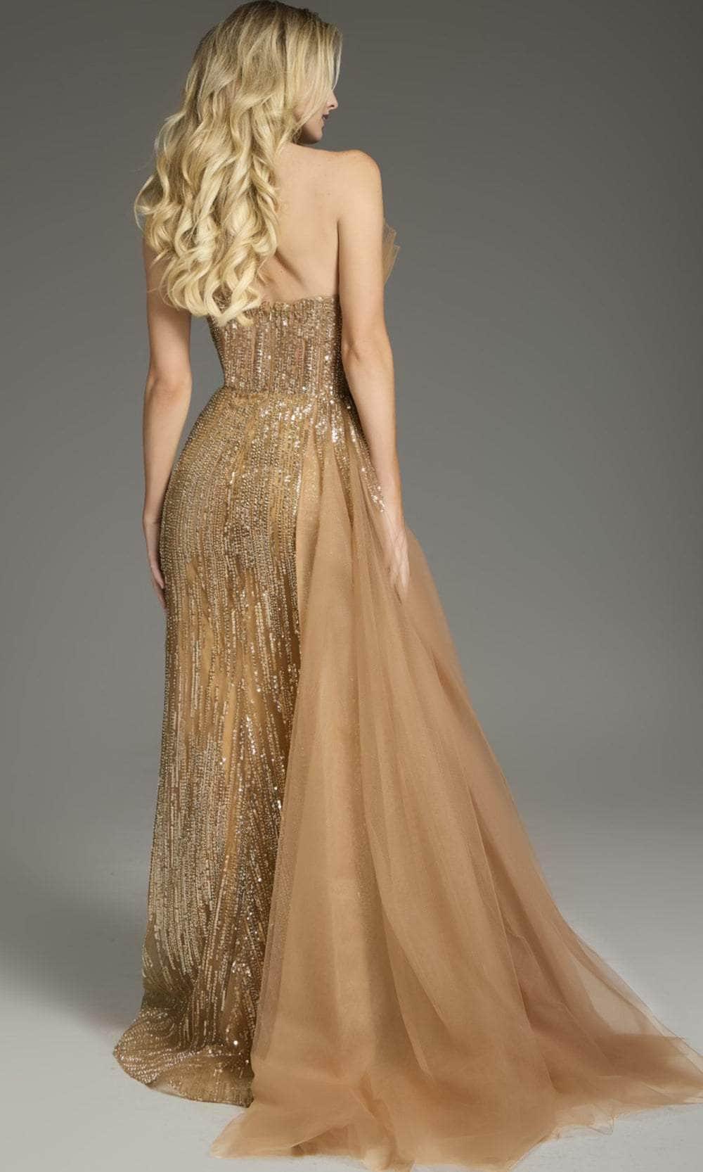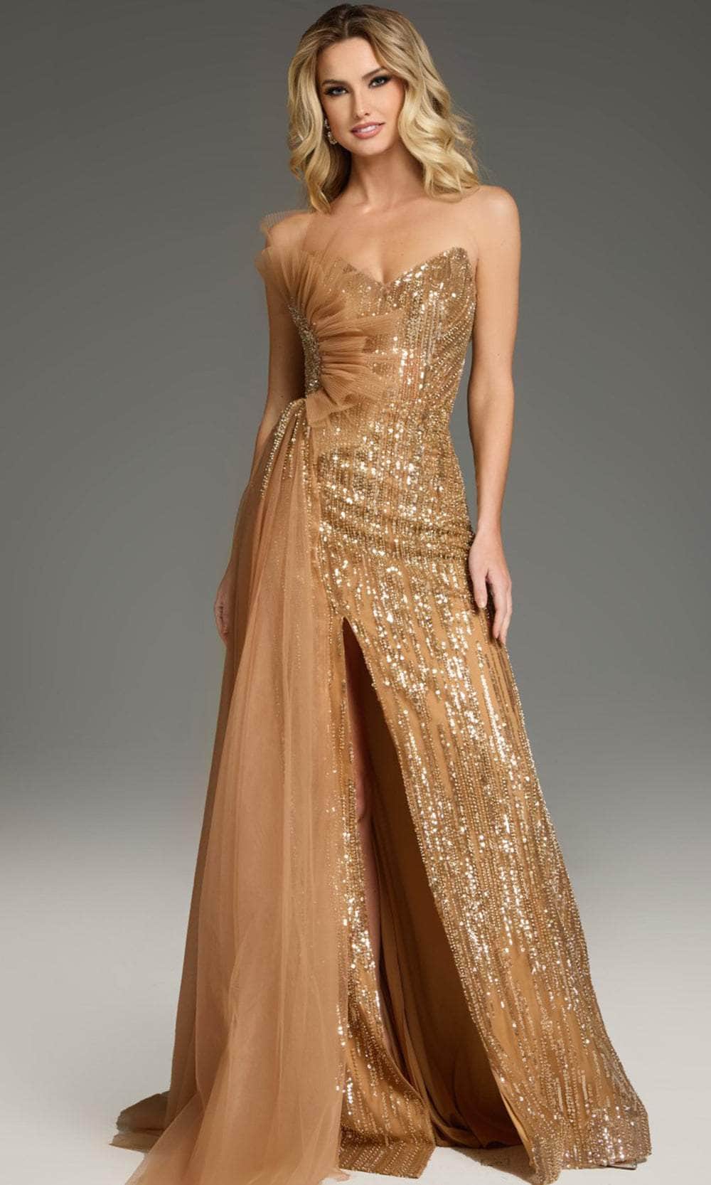 Display your daring style and unique flair to the world with the Jovani 39387. This stunning full-length gown features a captivating strapless neckline that beautifully frames the shoulders. The flattering A-line silhouette gracefully enhances your figure, ensuring a timeless look. The bodice is adorned with shimmering sequins, adding a touch of glamour and sparkle. A high slit graces the floor-length skirt, where delicate layers provide a soft and elegant contrast. This Jovani 39387 captures both sophistication and allure, making it a perfect choice for any formal occasion. Model is wearing Brown color.