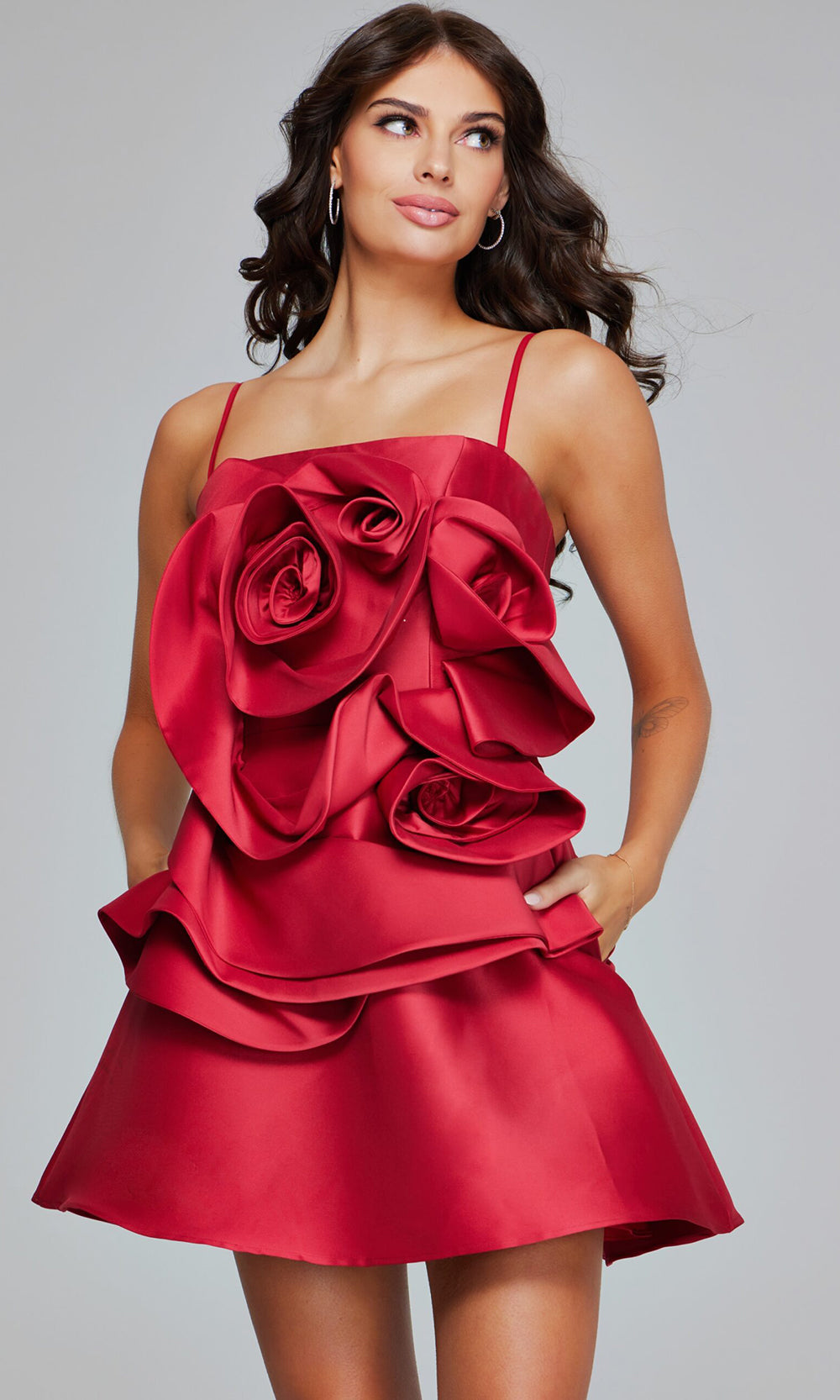 Luxury blooms into fashion with the Jovani 39750 satin mini dress where dramatic florals shape the entire look. The standout feature is a cascade of sculptural ruffle rosette appliques layered across the bodice, creating a textured and dimensional focal point. Its fitted bodice with thin straps and square neckline offers balance against the voluminous front detail, while the mini A-line skirt adds playful contrast. Whether viewed from the front or the side, this look holds visual interest at every angle. Step into special occasions with the unforgettable Jovani 39750 and make art part of your wardrobe. Model is wearing Red color.